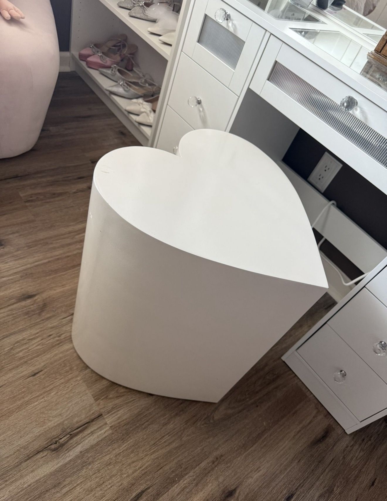 • Heart table. Smooth, glossy white finish • Sturdy and solid. Scuffs shown in photos • See photo with tape for width and height. - perfect for sanding old paint down and redoing.