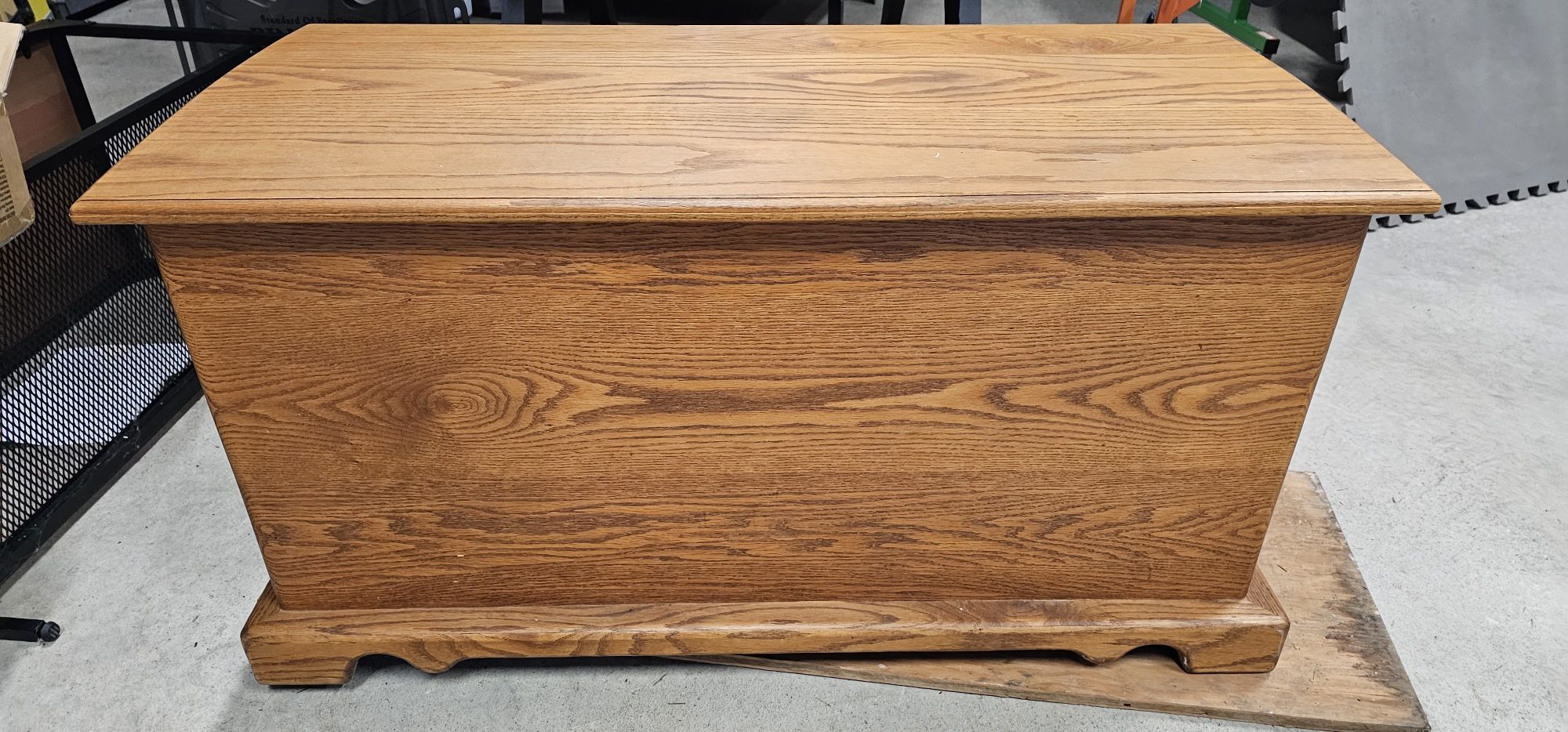 Cedar lined, in excellent condition, no scratches, lid is hinged and has locking feature. As pictures show, currently sitting on plywood in shop now but has been stored warm and dry since purchase. No trades. 43inx20inx22in The chest is not sitting on concrete but I now notice that sitting in the cold shop the lid is starting to warp. The middle of the lid has bowed up about a half an inch. It still looks great though.