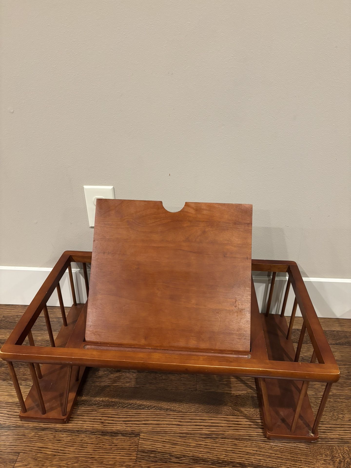 Sturdy wood reading/laptop table with 3 adjustable tilt levels. Perfect for using a laptop, reading, or eating on the bed or sofa. Used with normal wear, fully functional. - 3-level adjustable angle - Easy to move and versatile - Solid wood construction