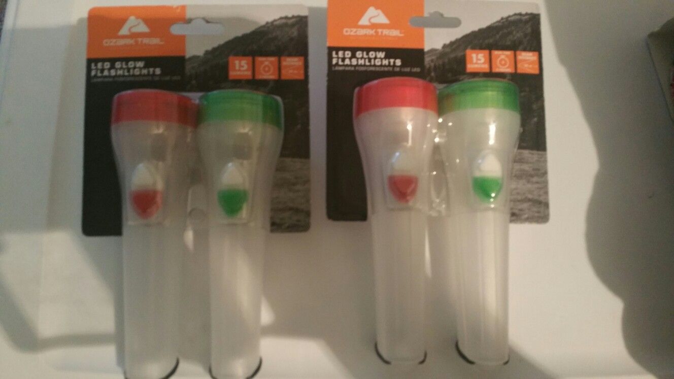 Ozark Trail led glow flashlights 15 lumens , 2 hour run time and 20m beam distance. Batteries included. 2 pack