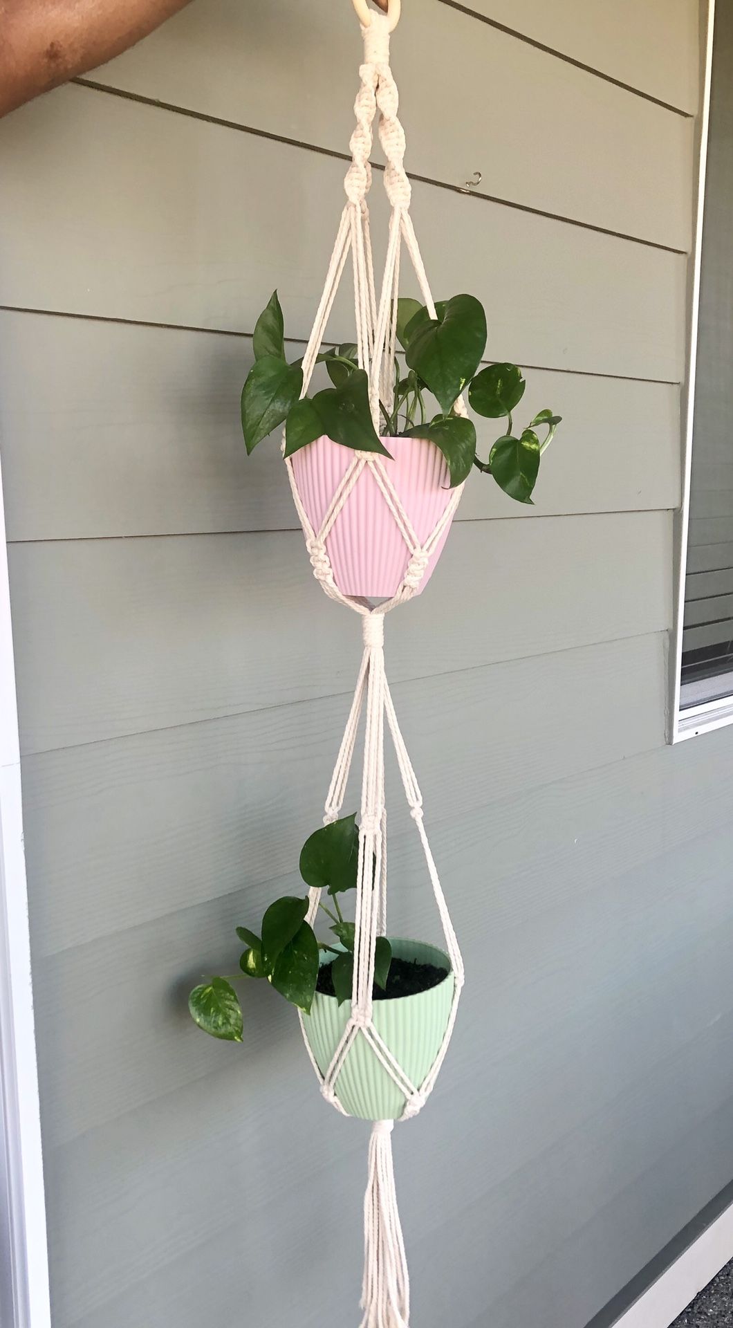 Handmade Macrame double plant hanger Beautiful and healthy golden pothos plants Sturdy and Quality plastic pots which has ceramic look Made with 100% cotton rope Measures 48 inches long Without pots -$35 With pots - $55