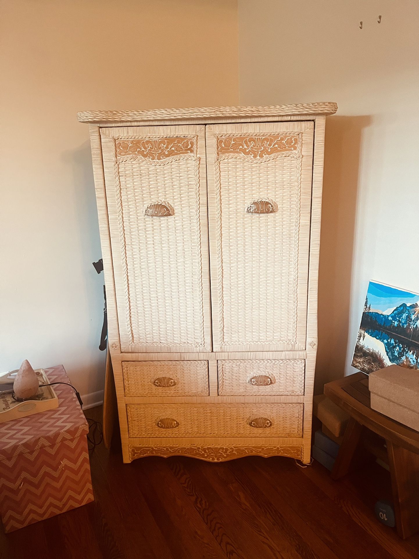 Beautiful Pier 1 imports white wicker armoire . Great for storage or fits a small tv inside. 60in x 35in x 21in