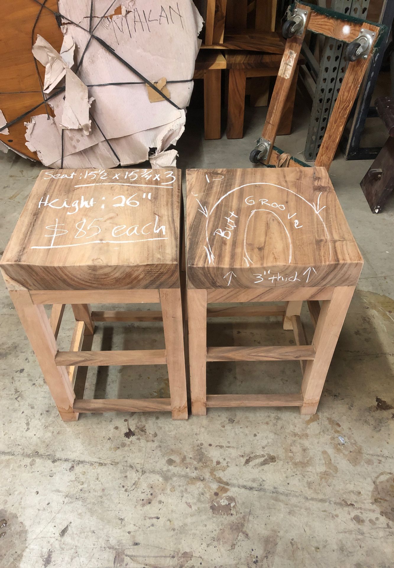New barstools made of from Suar Wood I’m Bali Seat 15 1/2” x 15 3/4” x 3” thick 26” high with Butt Groove for extra comfort $85 each
