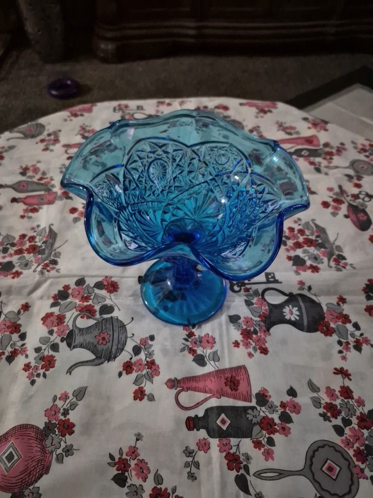 Blue candy dish, price $,10, carnival glass, no cracks.