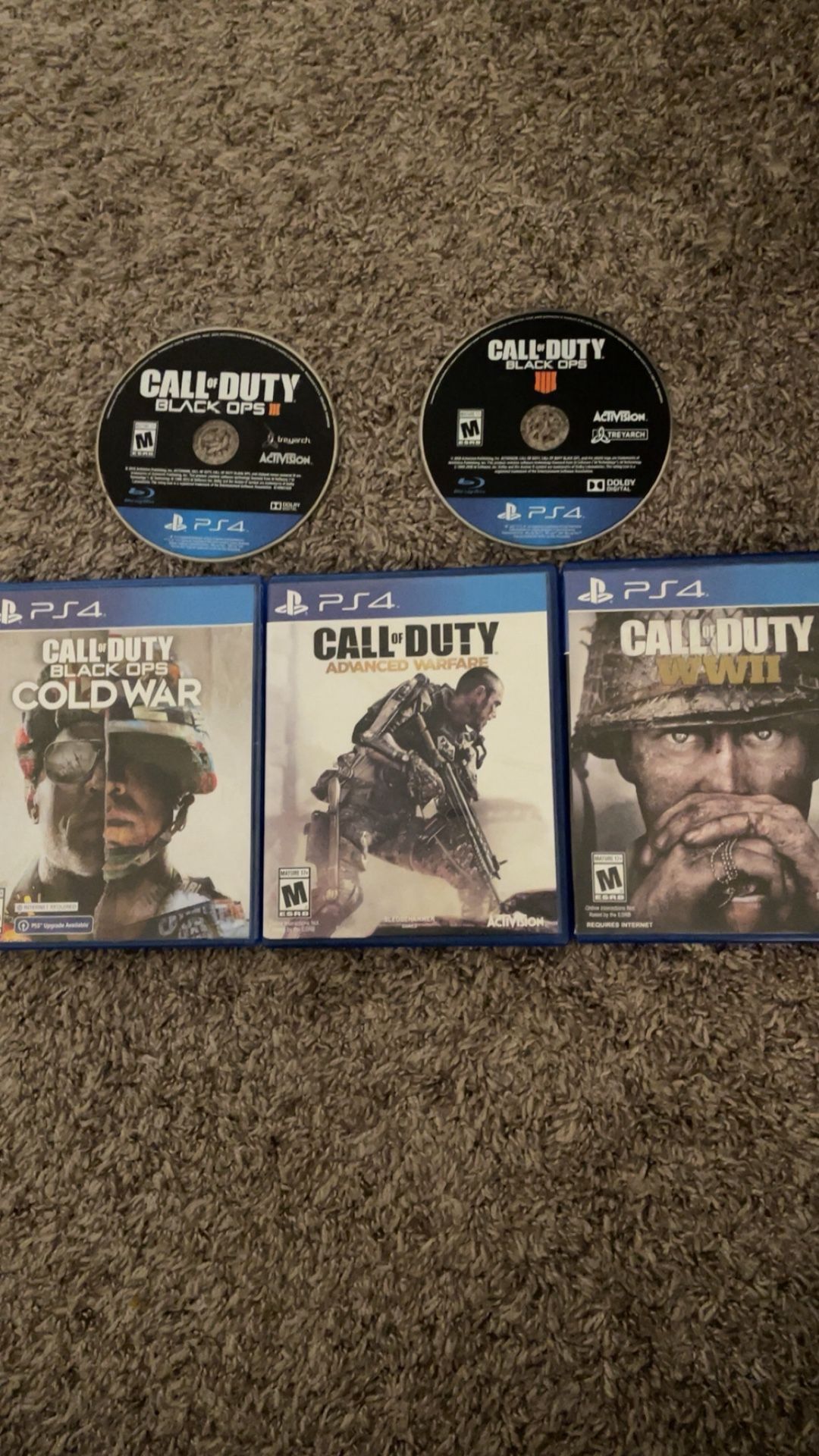 I am selling call of duty black ops 3 and 4 along with world war 2, Cold War and advanced warfare. These would normally be 50$ dollars each at a store but i am selling all of them at the price of 100$. These games also work on ps5.