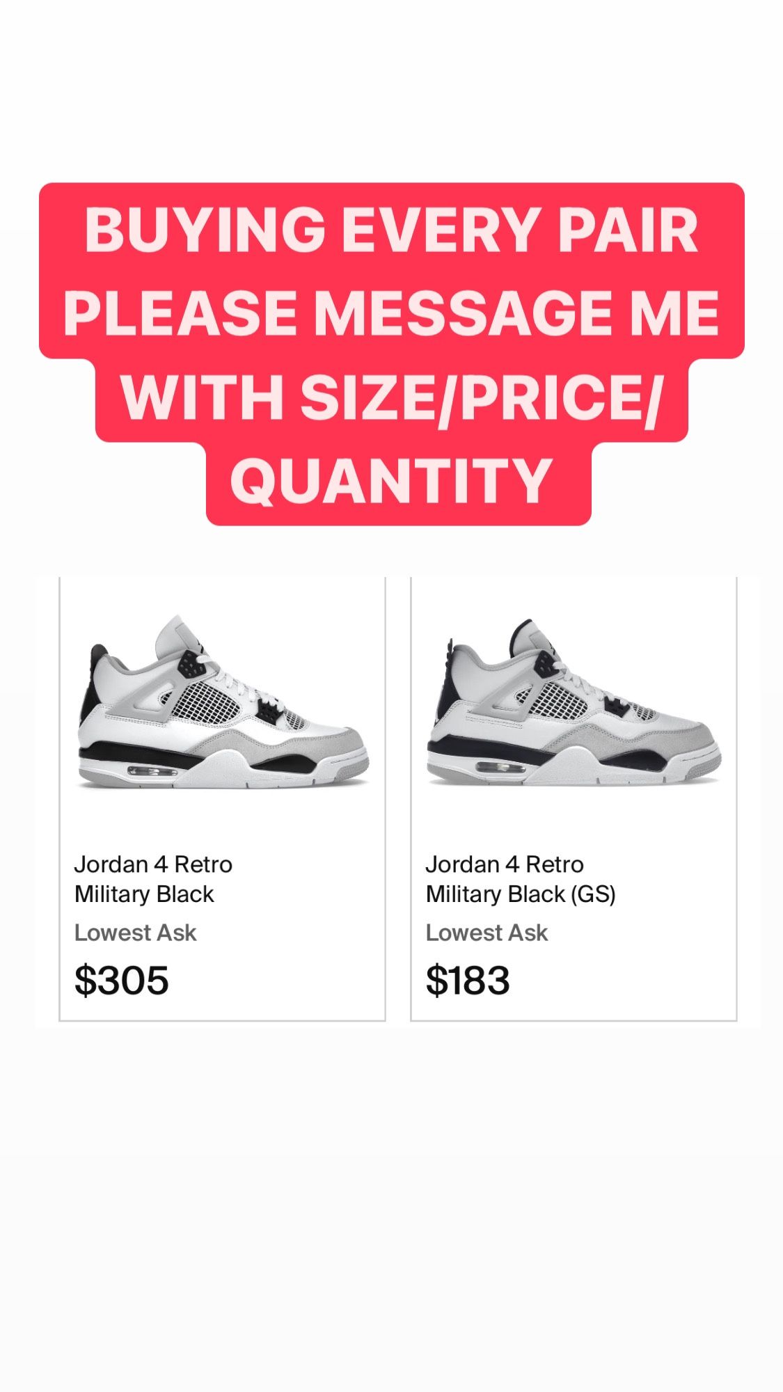 BUYING EVERY PAIR OF JORDAN 4 MILITARY BLACK. GS AND MENS SIZING. MESSAGE ME!