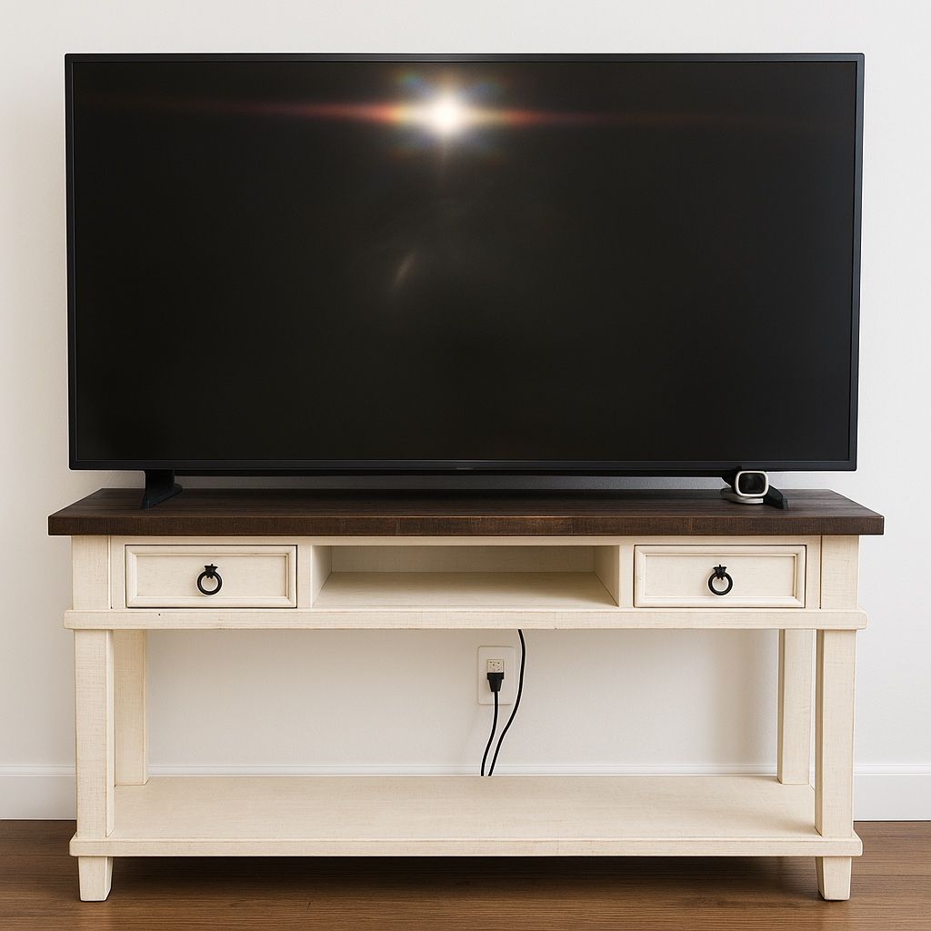 65” Samsung Tv, Cream And Brown Colored Tv Stand With Drawers