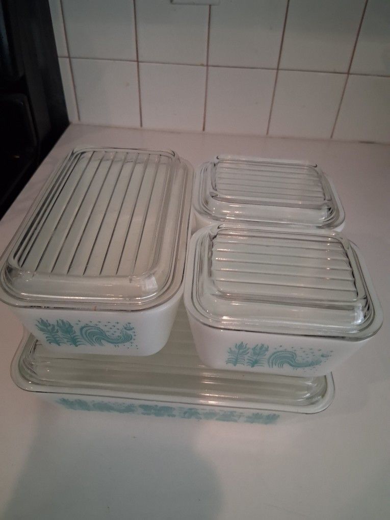 Vintage set includes 4 containers and 4 lids. 2 small same size and 1 med. Size, 1 large. All in great condition .