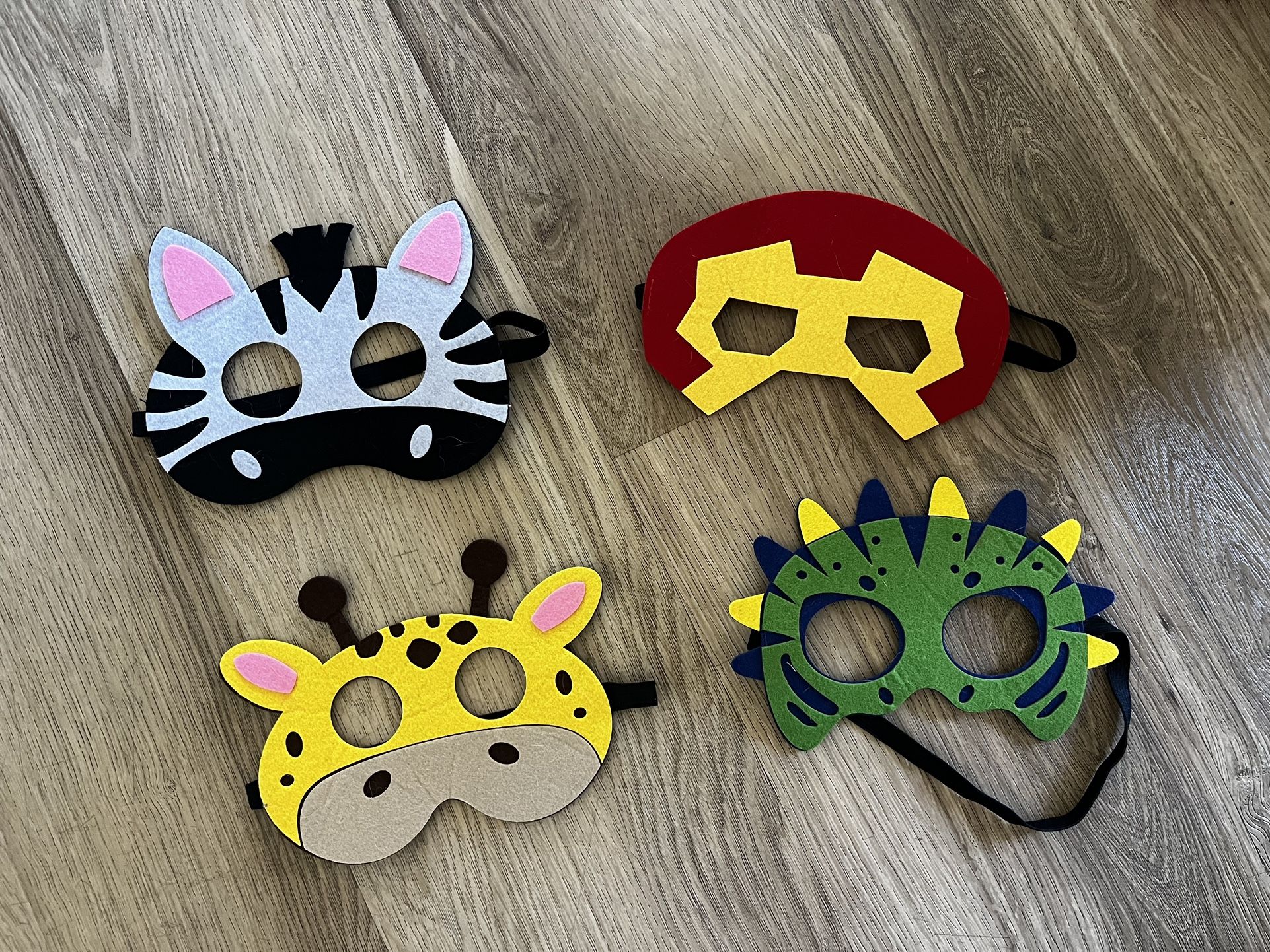 Assorted kids dress-up masks; zebra, giraffe, dinosaur, iron man. Sold as a set.