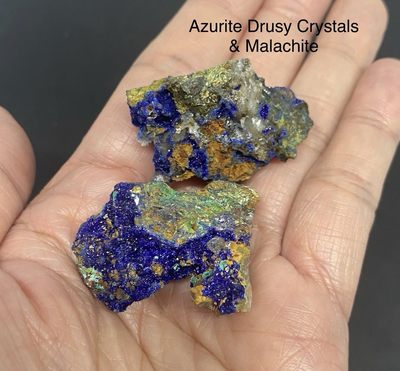 Very sparkly Deep Blue Azurite Drusy Crystals with Malachite. Pictures taken under light and enlarged to show detail and color of stones. Beautiful stones - lots of Drusy crystals. Pictures don’t do it justice!! ❤️Azurite is also known as a stone of heaven. It will give insight in all areas of your life, and it will stimulate your creativity❤️ will enhance your intuition and get rid of all the blockages that are preventing you from living the life that you want. It will remove your coldness and replace it with feelings of love and compassion. ❤️Malachite’s striking green color will encourage you to take action and allow change to happen. ❤️It is a stone of balance, abundance, manifestation, intention, & transformation❤️It draws out negative energy❤️ a highly protective stone, absorbs pollution, purifies and shields radioactivity.