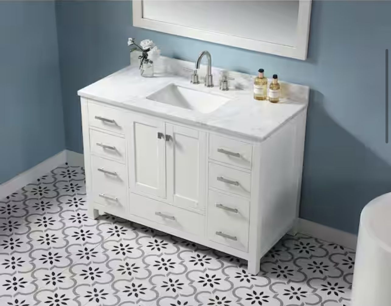 Monte 48in.W X22in.DX35.4 in.H Bathroom Vanity in White with Marble Stone Vanity Top in White with Single White Sink Won’t fit in small ‼️car truck or van highly recommend LOCATED IN MONTCLAIR PICK UP ONLY‼️ ❗️All items are FINAL SALE unless stated otherwise in the listing’s description. All items can be tested or reviewed in person