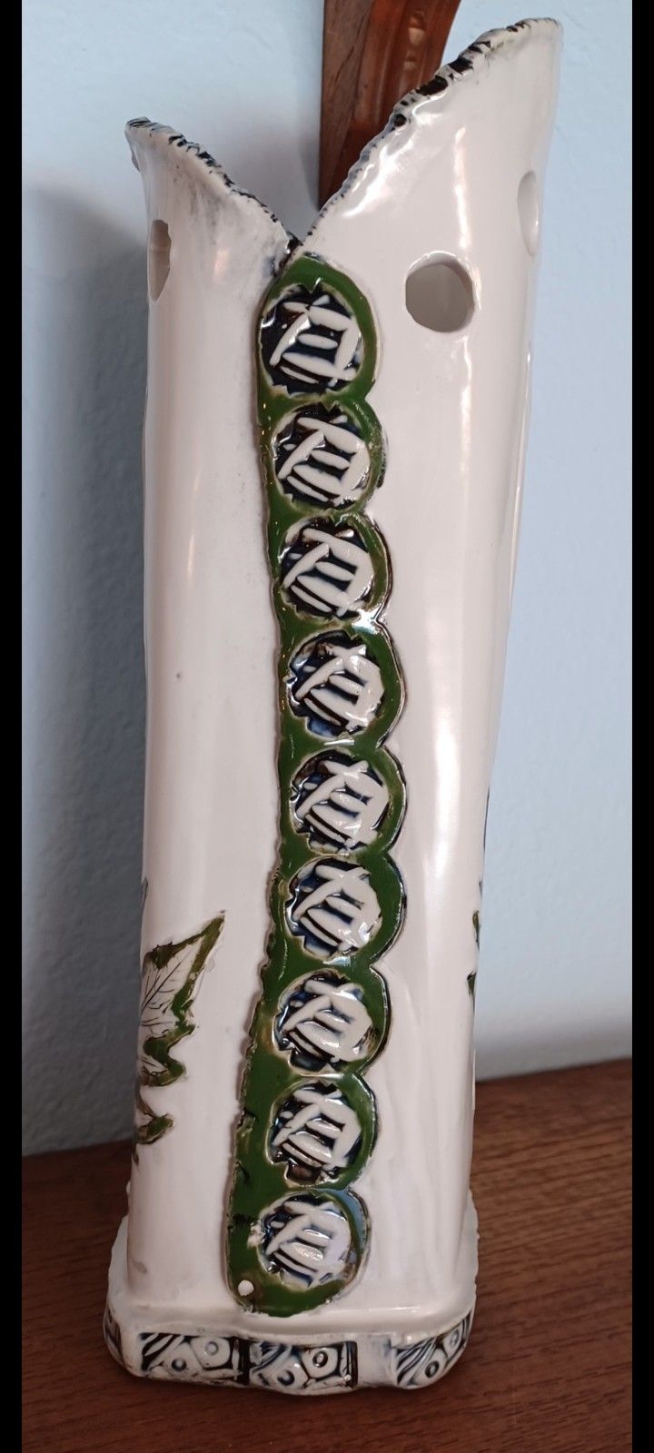 Signed Terry Accomando Ceramic Pottery Luminary , often also referred to as Candle Holders or Lanterns. It cast decorative patterns through the cut out designs when Candle is lit or LED is turned on. Terry Accomando creates functional and decorative ceramic pieces with interesting details. Size : 14.5" T x 4.5 " W. Weight : 4 lbs.