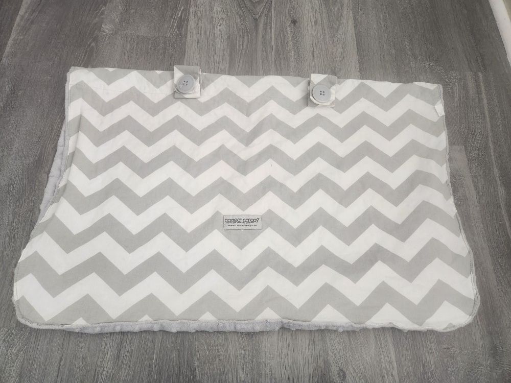 As picture, some of the thread around the button is worn, but the button is just decoration since it actually attaches to the carseat with velcro. Easy to use, good for blocking the sun and light and wind but still allowing some in. Pickup Elliot and Alma school. Cash or venmo