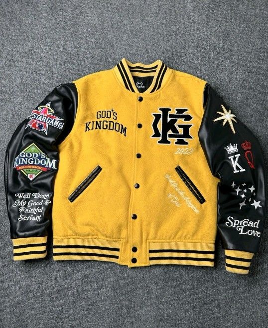 Mens Varsity Jacket Gods Kingdom Yellow Black Wool Leather, Size L