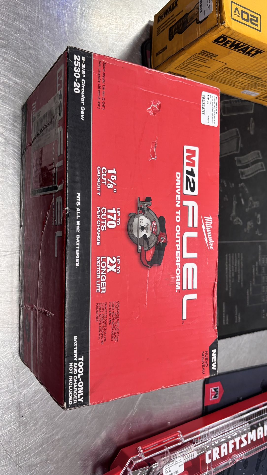 Brand new Sealed Milwaukee M12 fuel 5-3/8” Circular saw tool only Rpm 3,600 Arbor size 10mm Cut depth 90 - 1-5/8” / 45 - 1-1/8” Maximum bevel 50 degrees