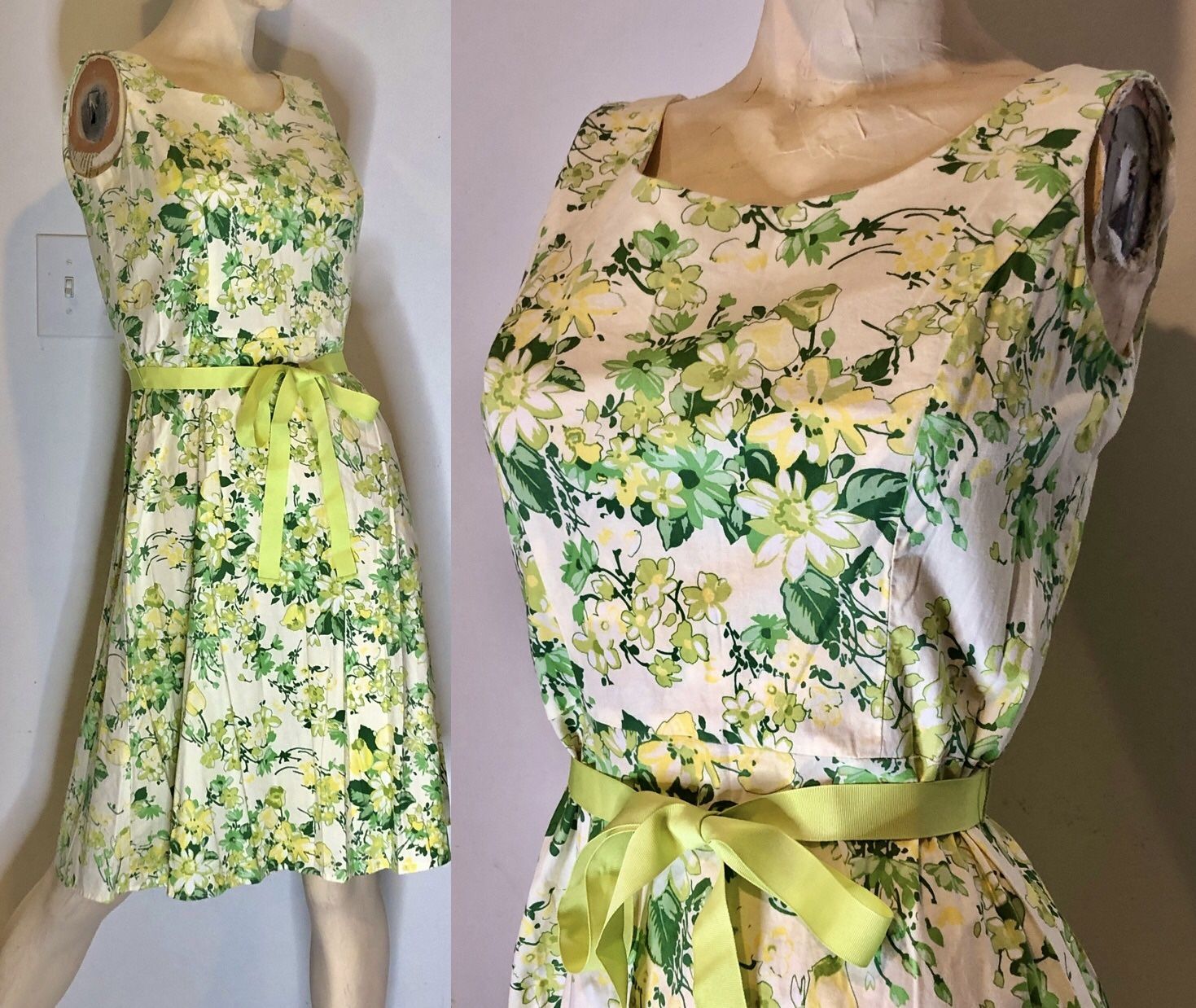 Vintage Y2K tank kneelength dress. Adorable, sleeveless floral print fit and flare dress, 1950s inspired design with ribbon tie sash at waste. Brand: Sheri Martin Style number: 22685 Size: 6 Era: Y2K Color: white, greens, yellow. Original tag price: approximately $80 Fiber content: 97% cotton, 3% spandex. Stretch: light two-way. Lined ?: yes Condition: excellent preowned Shows no visible wear or floss. Measurements: length flat, unstretched, side to side and top to bottom. Armpit to armpit: 18 inches Across waist: 14 inches Across hips: 22” Around Hemline: 72” Top of shoulder to hem bottom: 36”