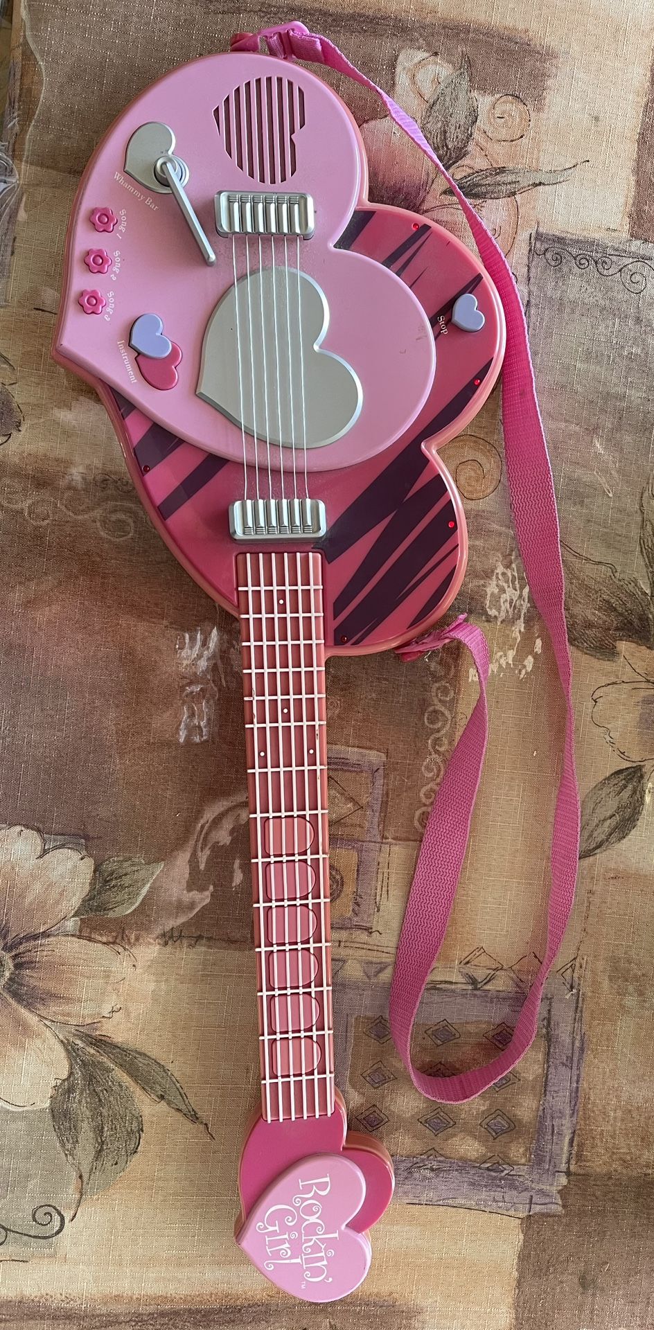 Lightly used – Rockin’ Girl Toy Guitar (Batteries Included) Item Description: Let your little rockstar shine with the Rockin’ Girl Guitar! Shaped like a heart and styled in vibrant shades of pink and purple, this fun musical toy lights up and plays sound effects for endless entertainment. Key Features: • Heart-Shaped Design: Eye-catching and perfect for young performers • Interactive Buttons: Plays music and sound effects • Whammy Bar: Add flair to your tunes • Strap Included: Easy to wear and play on the go • Lights & Sounds: Engaging and fun for kids • Batteries Included: Ready to play right out of the box Perfect for birthdays, dress-up, or pretend concerts!