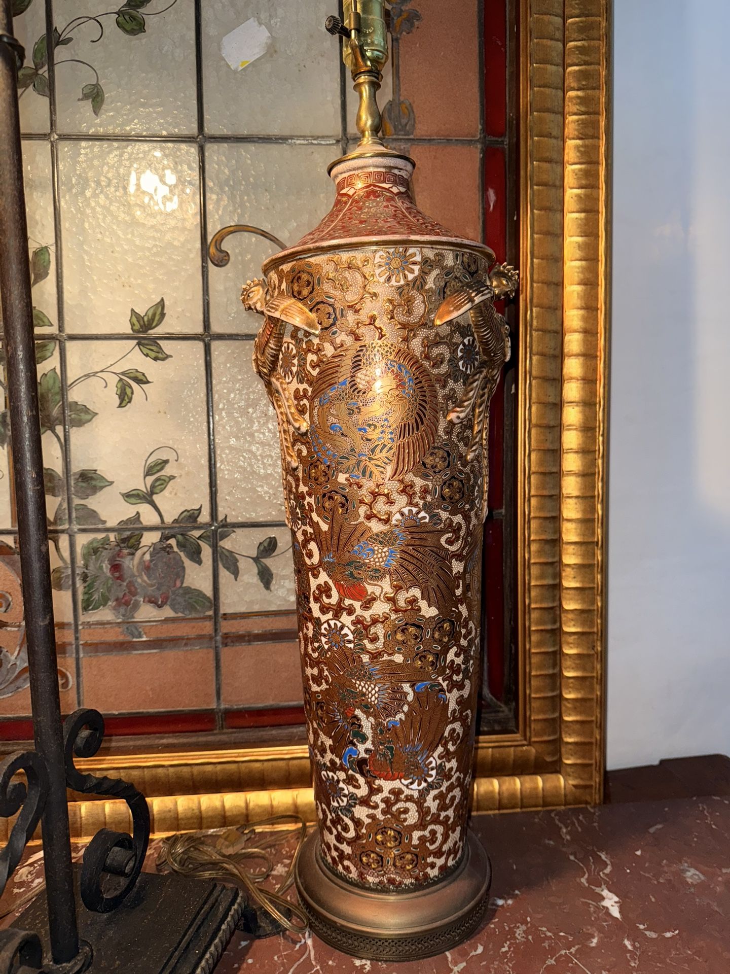 Antique 19th century Large Japanese Satsuma Oriental Vase that has been made into a lamp. It has raised relief with gilt gold throughout Has minor damage with very very old good repair at the top. Please see photos for measurements. Meiji Era