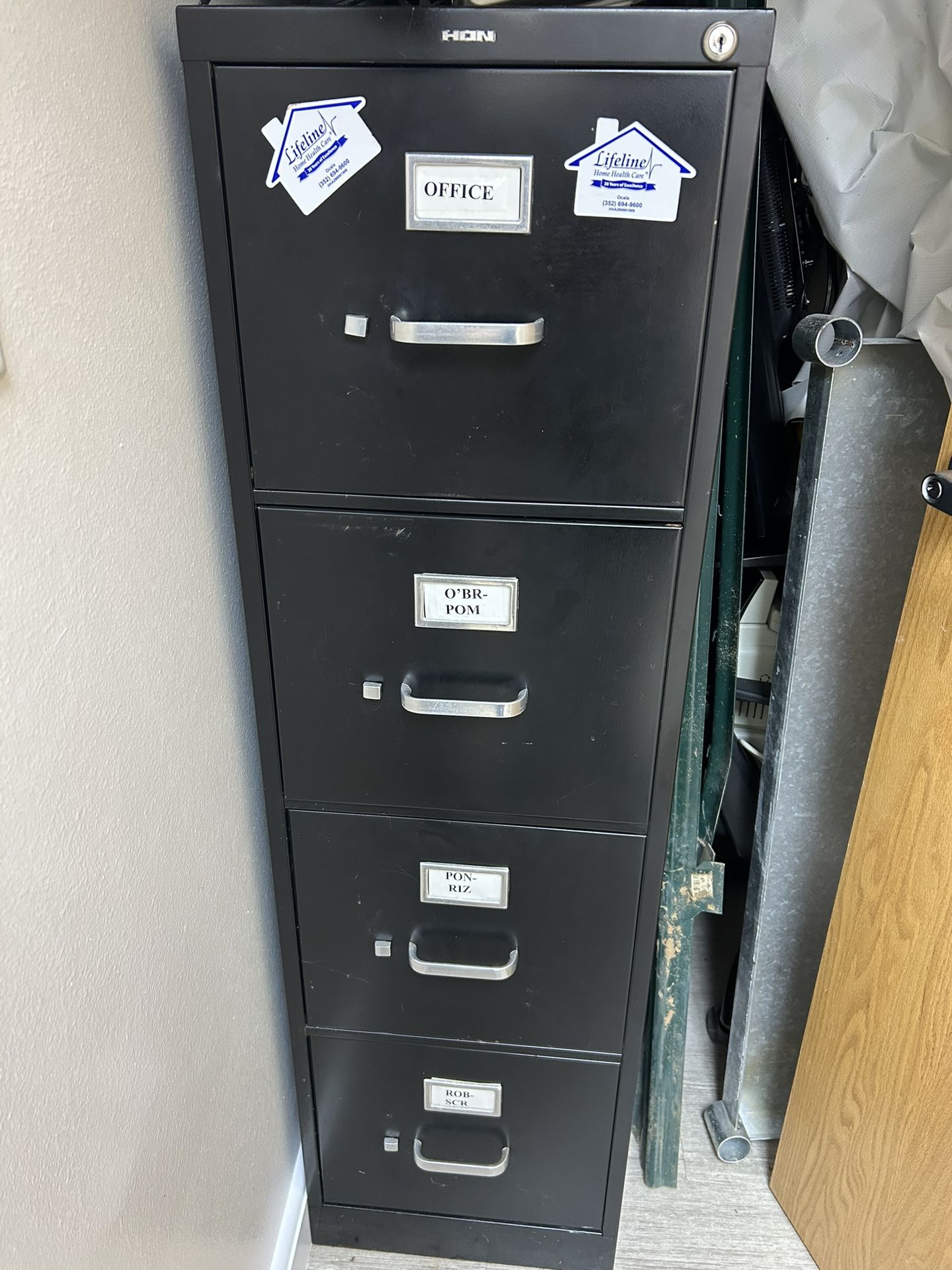 Metal 4 drawer filing cabinet works fine do not have key to lock it. Have 2 of them