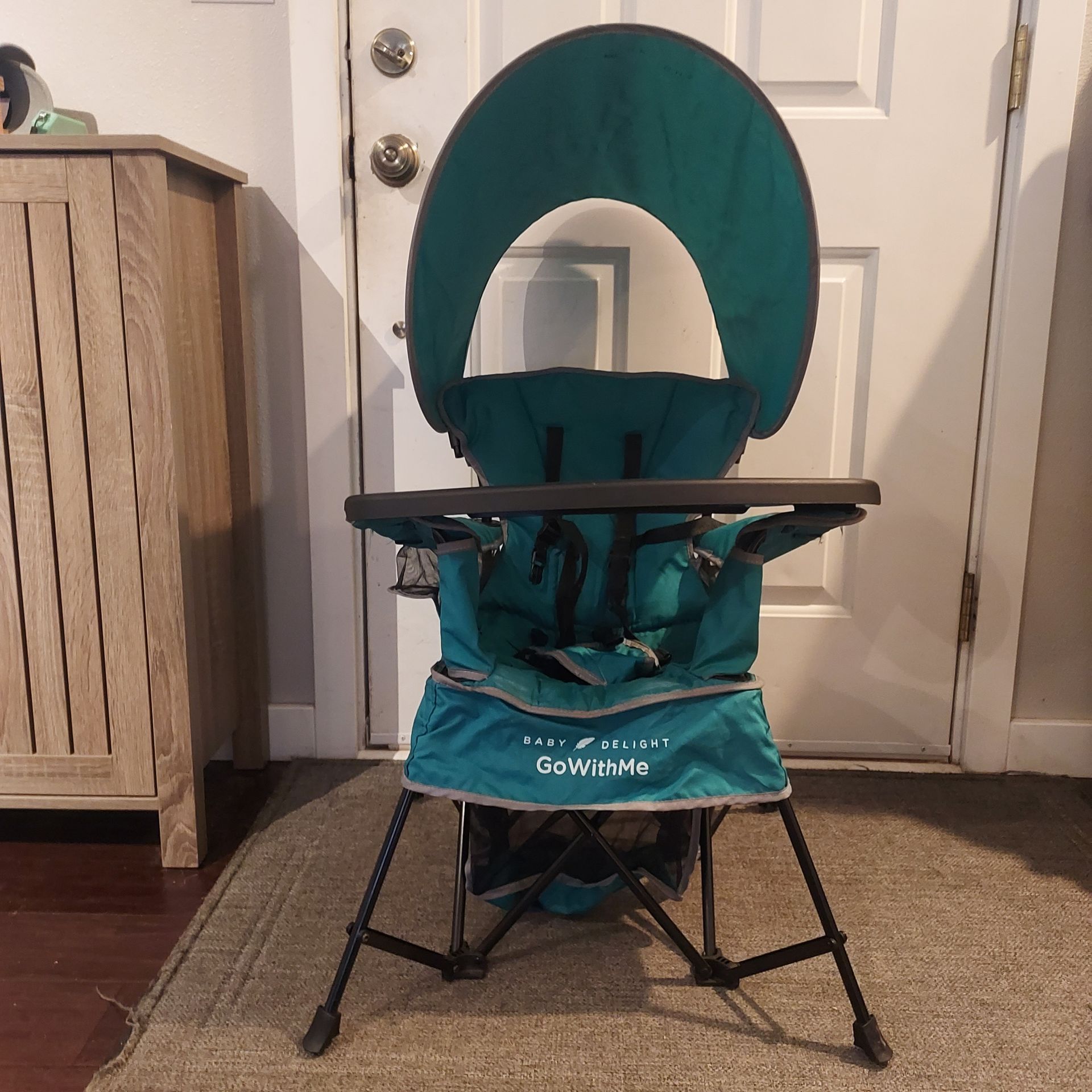 Baby Delight Go With Me Chair Teal comes in carrying bag along with tray table and sunshade. Tags: camping, travel, portable, packable