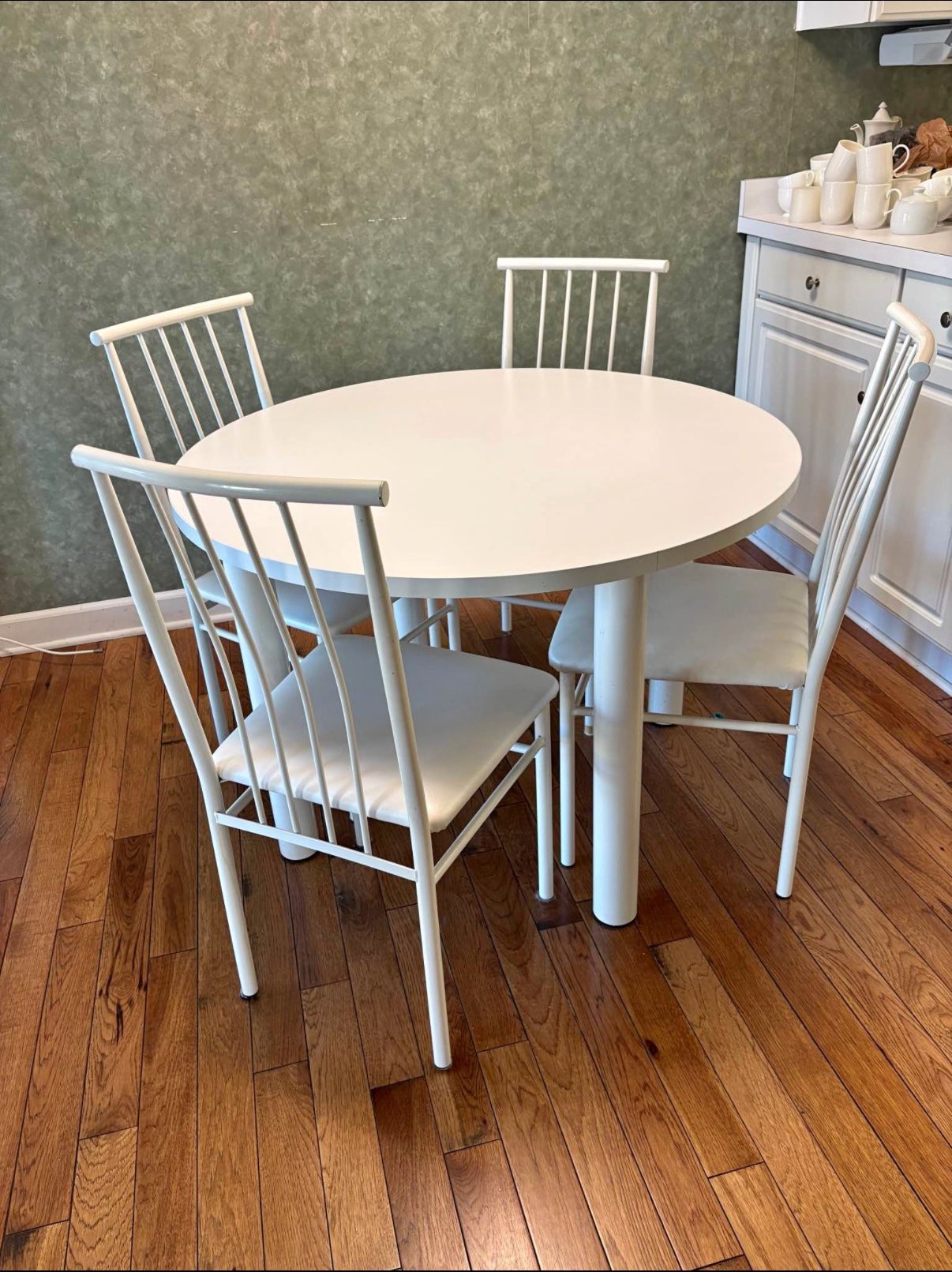 Selling a round dining table with four matching chairs. The set is white and would be perfect for a kitchen or dining area. The chairs have a simple, elegant design. It's in great shape and ready for a new home! 🛠️ Note: One chair cushion needs new screws from the bottom.