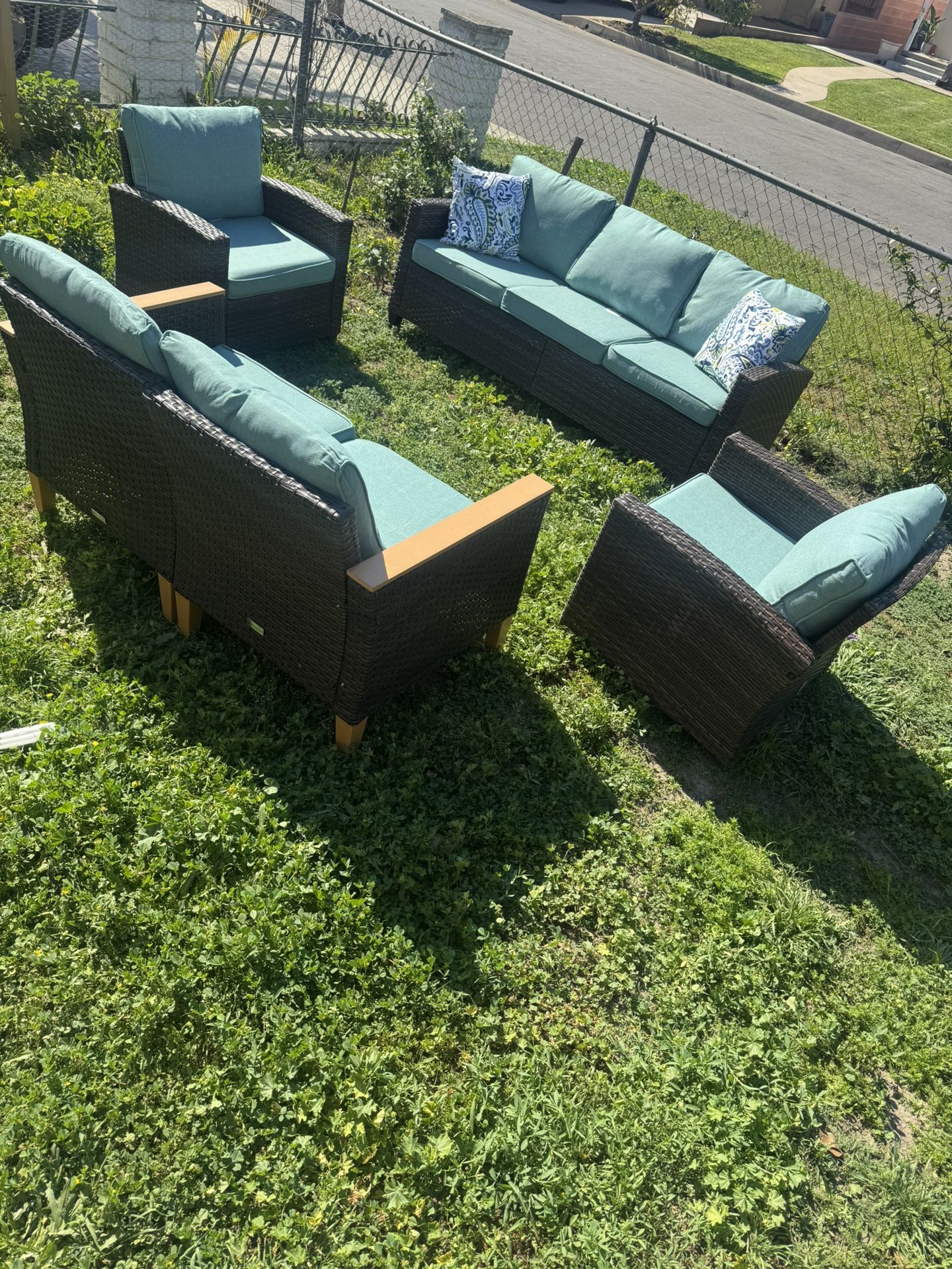 New rattan patio sofa set. Includes one 3-seater sofa, two sturdy single-seater sofas, and one 2-seater sofa. The 2-seater sofa features wooden accents on the armrests. Brand: WickerKing. Firm price.