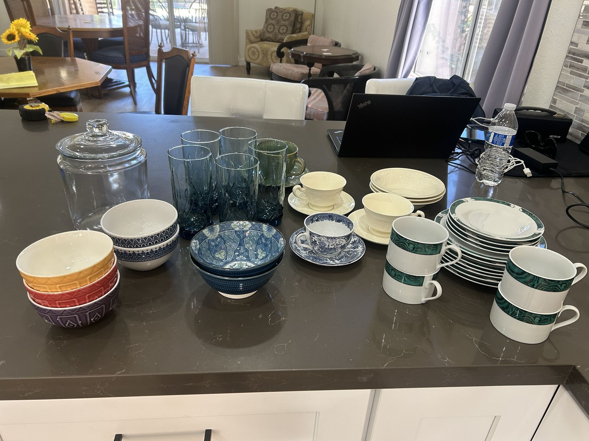 Each piece is perfect. Including 7 Wedgwood items, 15 Gabbay luncheon, 5 blue glasses plus other miscellaneous items