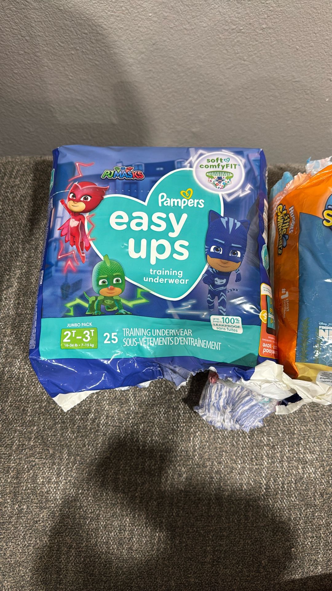 $10 for both of $5 each. Pampers easy ups training underwear size 2-3T. (21 diapers) Huggies Little swimmers size 4 Medium. (15 diapers)