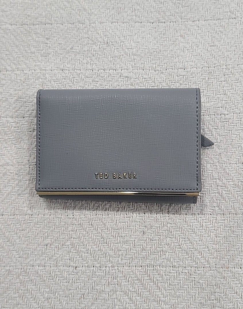 Ted Baker Snap Flap Card Coin Wallet in Gold Detailed is a stylish and functional accessory for women. Made from leather, this wallet features a solid gray color and a snap-flap style. It includes credit card slots for organization and a coin compartment for convenience. With the signature Ted Baker brand, this wallet is a perfect choice for those looking for a sophisticated and practical accessory to complement their outfit.