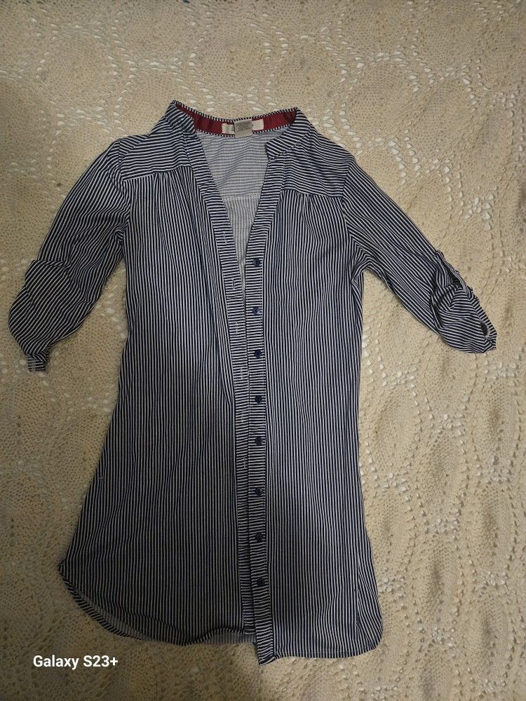 Cute navy & white striped tunic top with partial button-down front and roll-tab sleeves. Lightweight, comfy, and perfect with jeans or leggings. Excellent used condition!