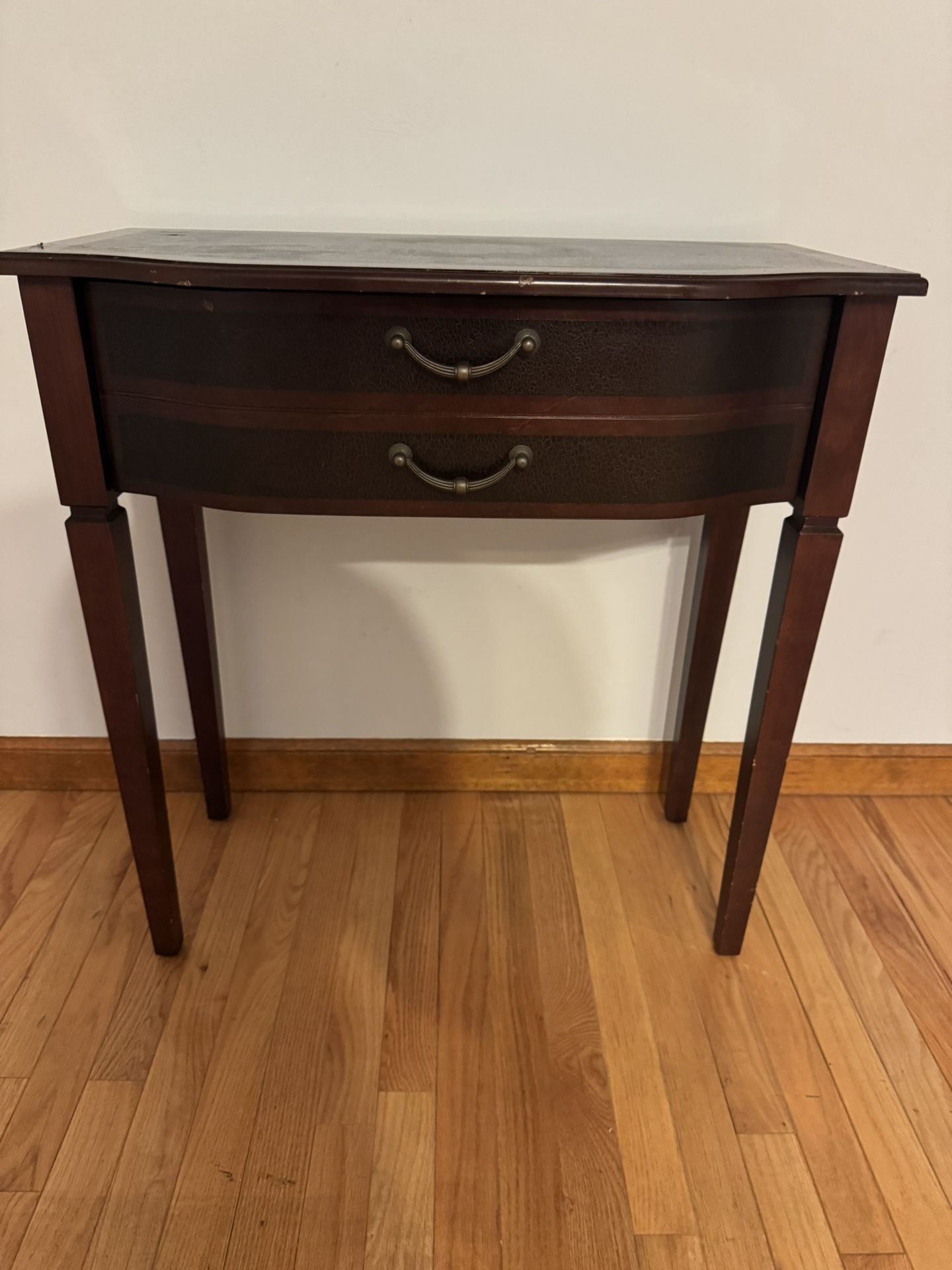 Matching set of 2 end/ or side tables. 29inch tall 27.5 long x 14 inches deep. Unique print. More of a cherry red wood with print on top. Open to negotiate