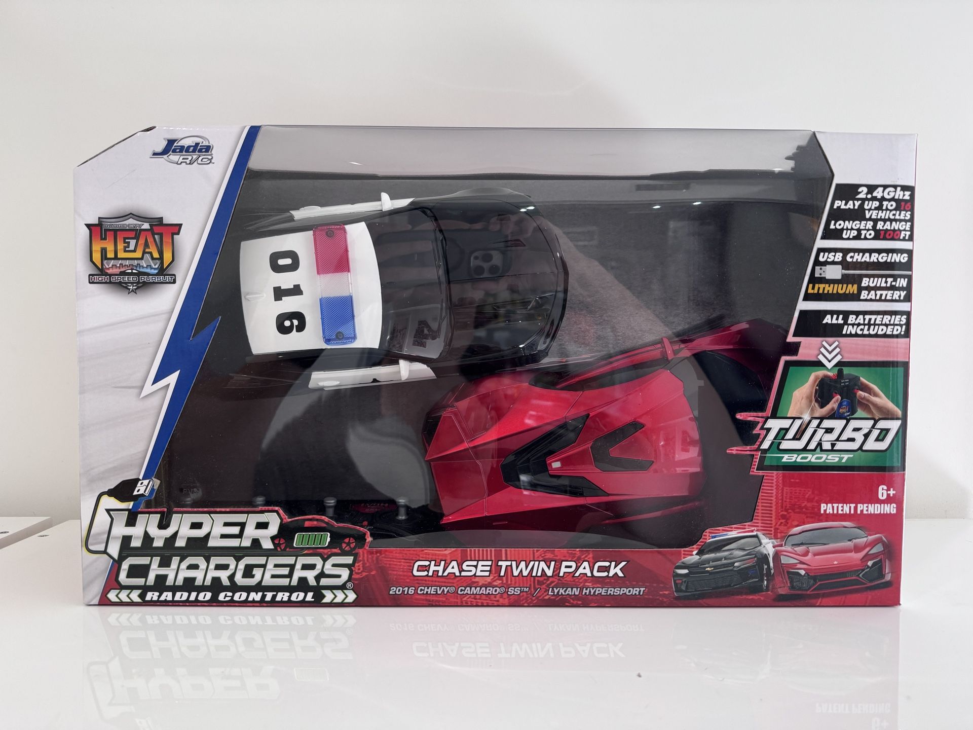 Jada Toys Hyperchargers Heat Chase Radio Control Vehicle - Twin Pack with USB Charging (2Piece), 1: 16 Scale, 2015 Dodge Charger SRT Hellcat & 2017 Fo