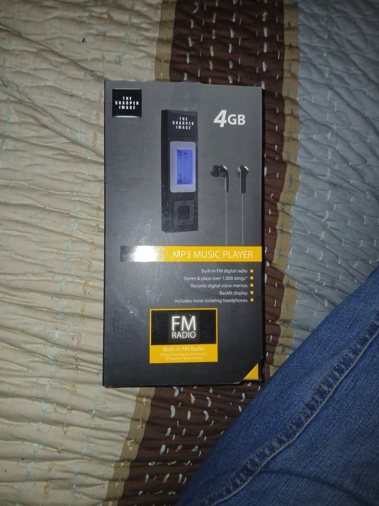 Built in FM digital radio , stores & plays over 1000 songs, includes noise isolating headphones. New in original packaging.