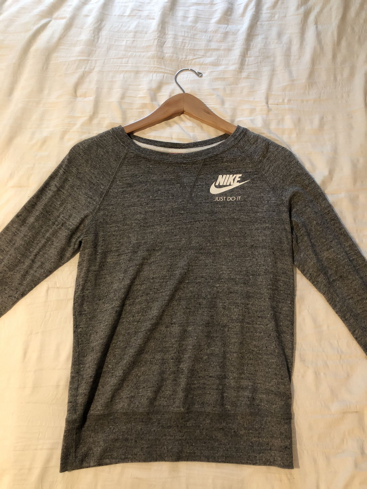 Grey long sleeve Nike shirt in size Small. Slightly thicker material – great for layering or workouts. Worn but in good condition.