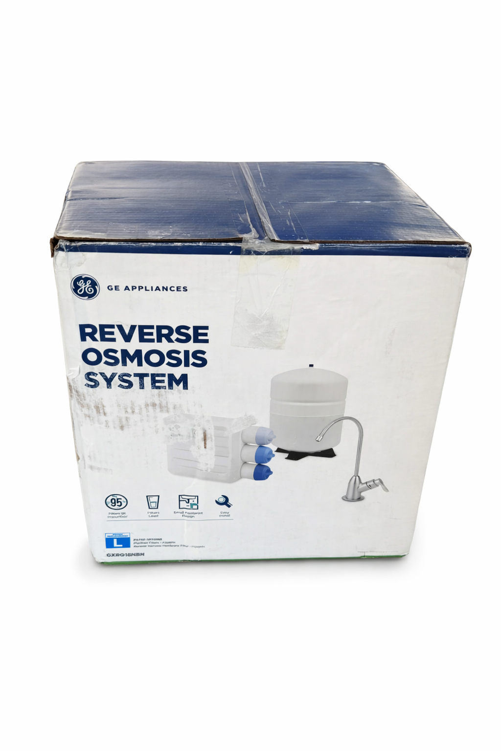 Open box GE Reverse Osmosis (RO) under-sink water filtration system. Includes storage tank, faucet, tubing, and installation hardware as shown in photos. Appears unused and complete. Original box shows wear from storage but contents are clean. Features: • Reduces up to 95% of contaminants • Lead reduction • Under-sink design • Includes storage tank • Faucet included • Easy installation system