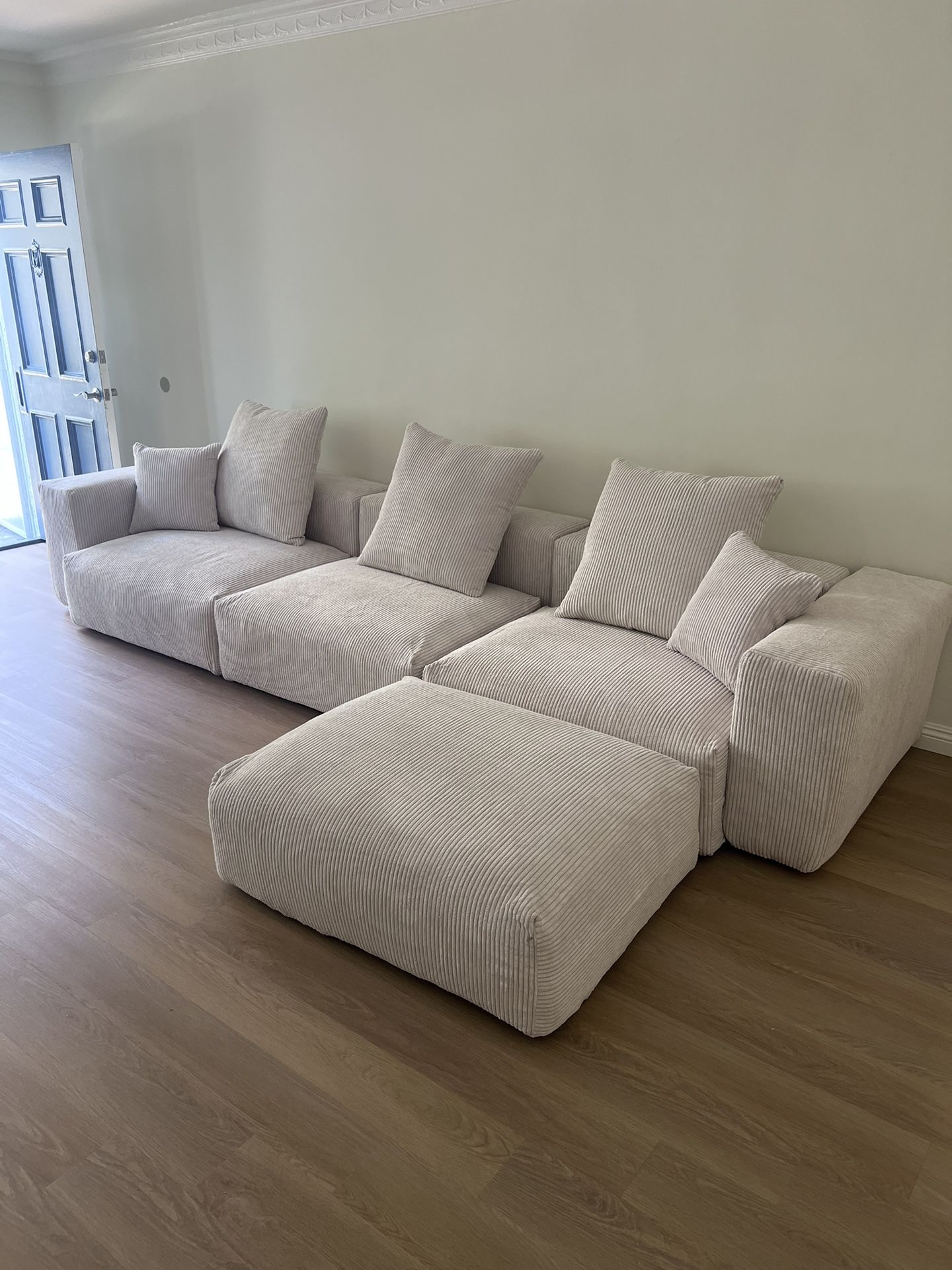 100% Machine Washable. All the covers come off for easy machine washing. Brand New in the box 📦. Configure in a few different ways to the left or right side of you living space. Each module comes with 4 inches of memory foam padding all over the frame for extra comfort and protection. Enjoy the extra soft feel of your Corduroy fabric. All pillows included. Colors: Beige Crème , Light Brown, Black Price - $1,595 (Delivery Included) Payment Options: Cash, Zelle, Card, Financing Affirm We are located in Tustin ca. Stop by for a viewing any day of the week. Overall dimension: 141.73 in. x 74.8 in. x 24.8 in. Ottoman dimension: 39.37 in. x 39.37 in. x 15.74 in. Slip cover of seat and back cushions are easily changeable and removable, easy to clean