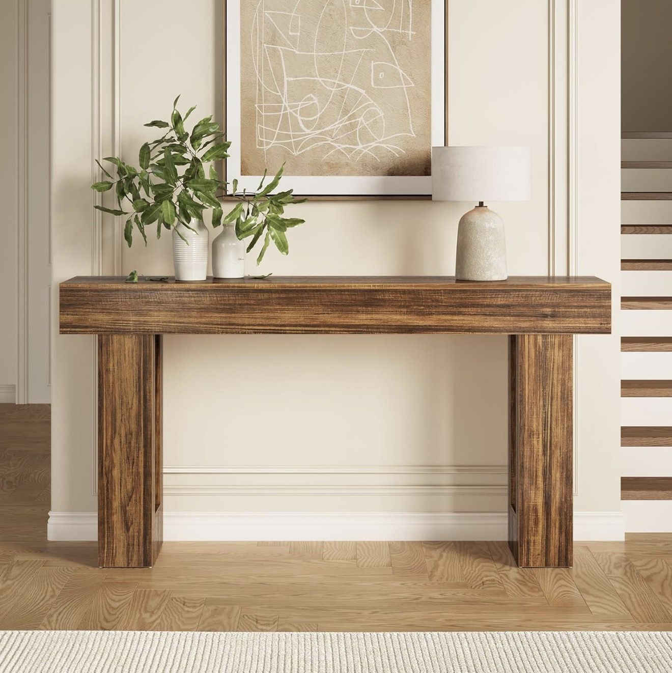 New in box. Retails for $165 63-Inch Extra-Long Size: Perfect as an entryway table, behind-couch sofa table or hallway table. Spacious surface fits entry foyer, living room, balancing space and functionality for daily use Sturdy Wooden Construction: Crafted with high-quality E1 MDF and industrial design, this rustic brown console table boasts durability and stability, resisting wear for long-term use Vintage Industrial Style: Rustic brown finish blends with industrial elements, adding a warm, retro vibe to any home decor, matches modern, farmhouse or industrial interiors seamlessly Multi-Scene Application: Ideal for placing keys, lamps, vases or books. Works great as an entry foyer table, behind-sofa accent table or living room display table, meeting diverse needs