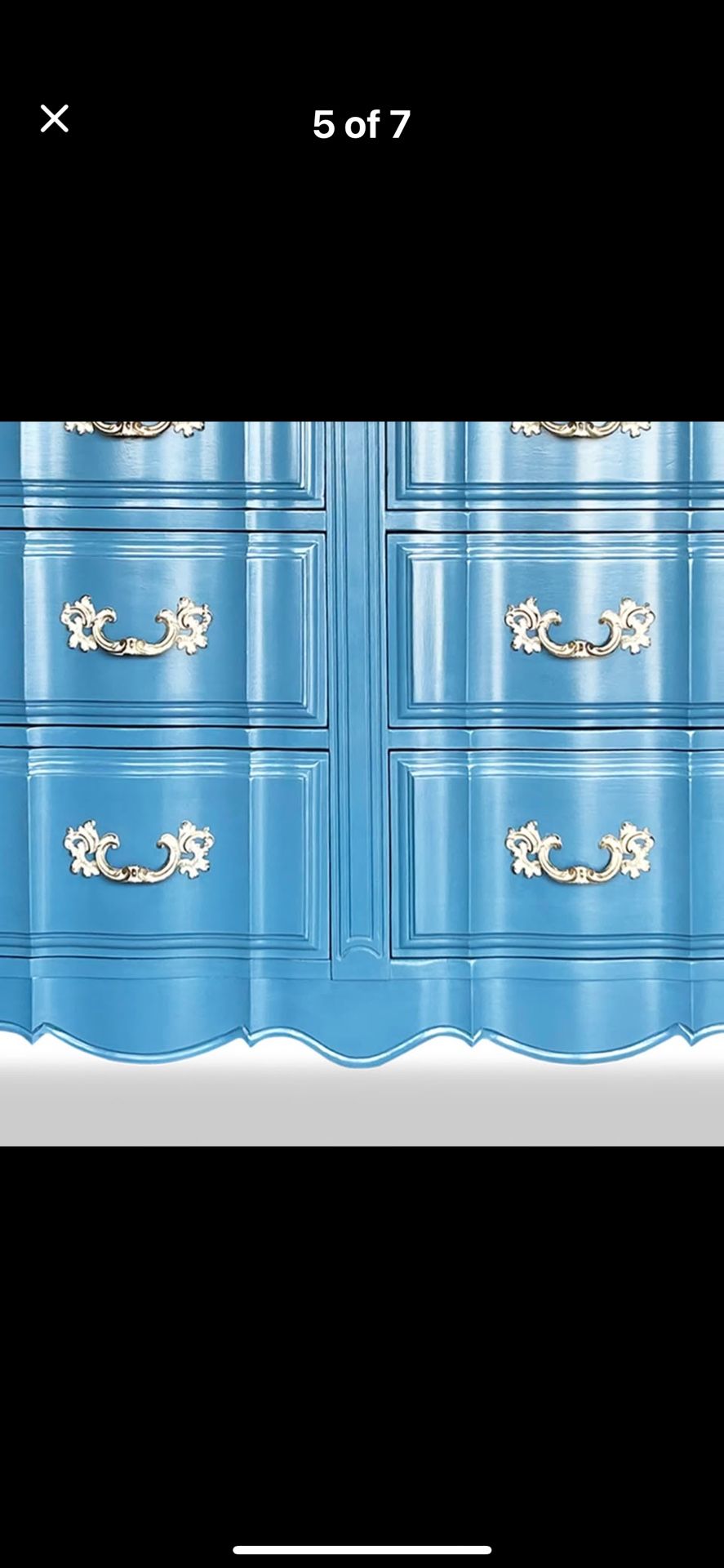Blue refinished dresser 19” deep 74” wide 33.5” tall. Delivery available for fee.