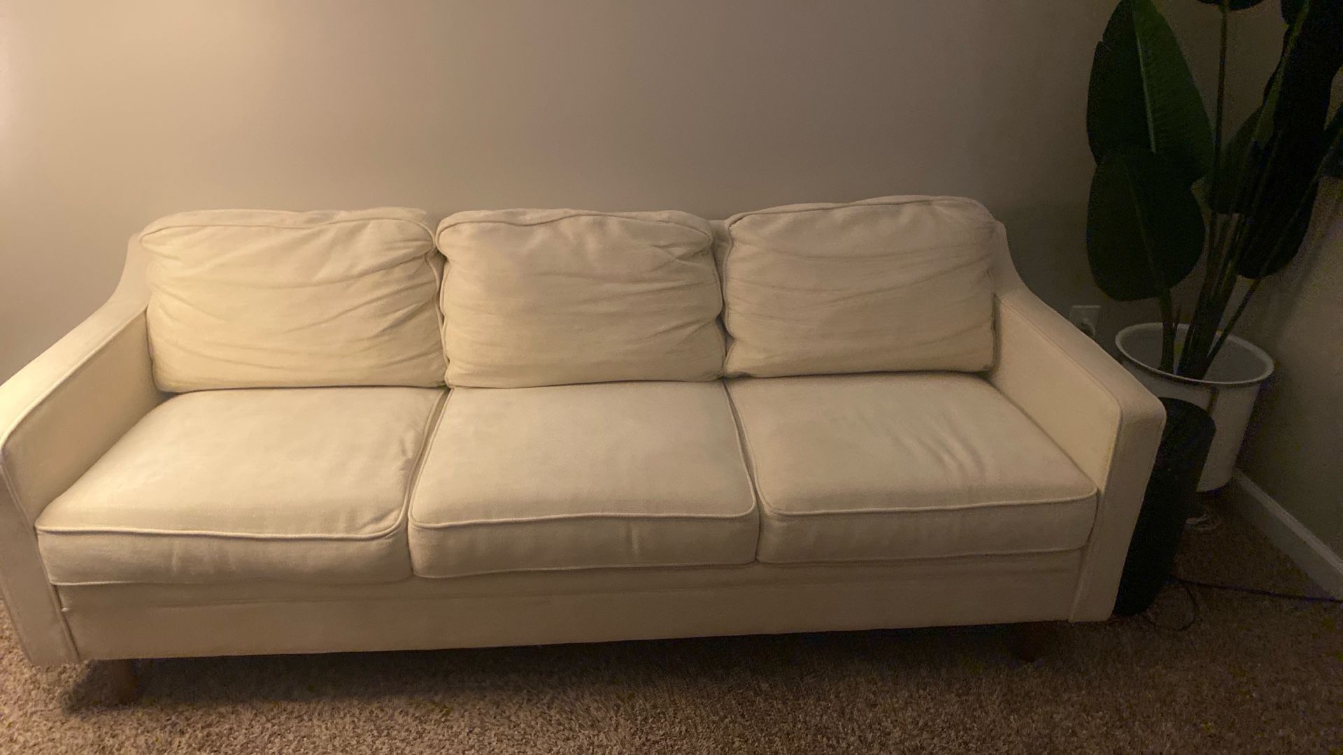 Cream, fabric, 3-seat sofa. Gently used. Very clean, no stains. Generally covered but exposed for photos.