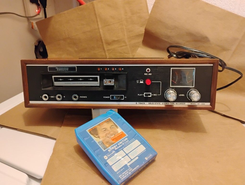 Good used condition, from 1970's, few small mars to the wood, missing small button top on front Vintage Retro Transcriber B Track Player Solid State Stereo Tape Recorder 1970's RP-1000 Includes Bobby Vinton 8-Track Melodies of Love 1974 ABC Records ***NW corner Dobson & 8th Ave, Mesa