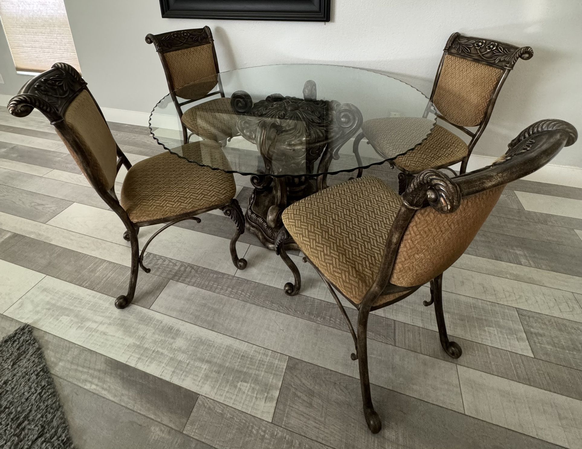 Round glass table with 4 chairs Comes from pet-free, smoke- free home