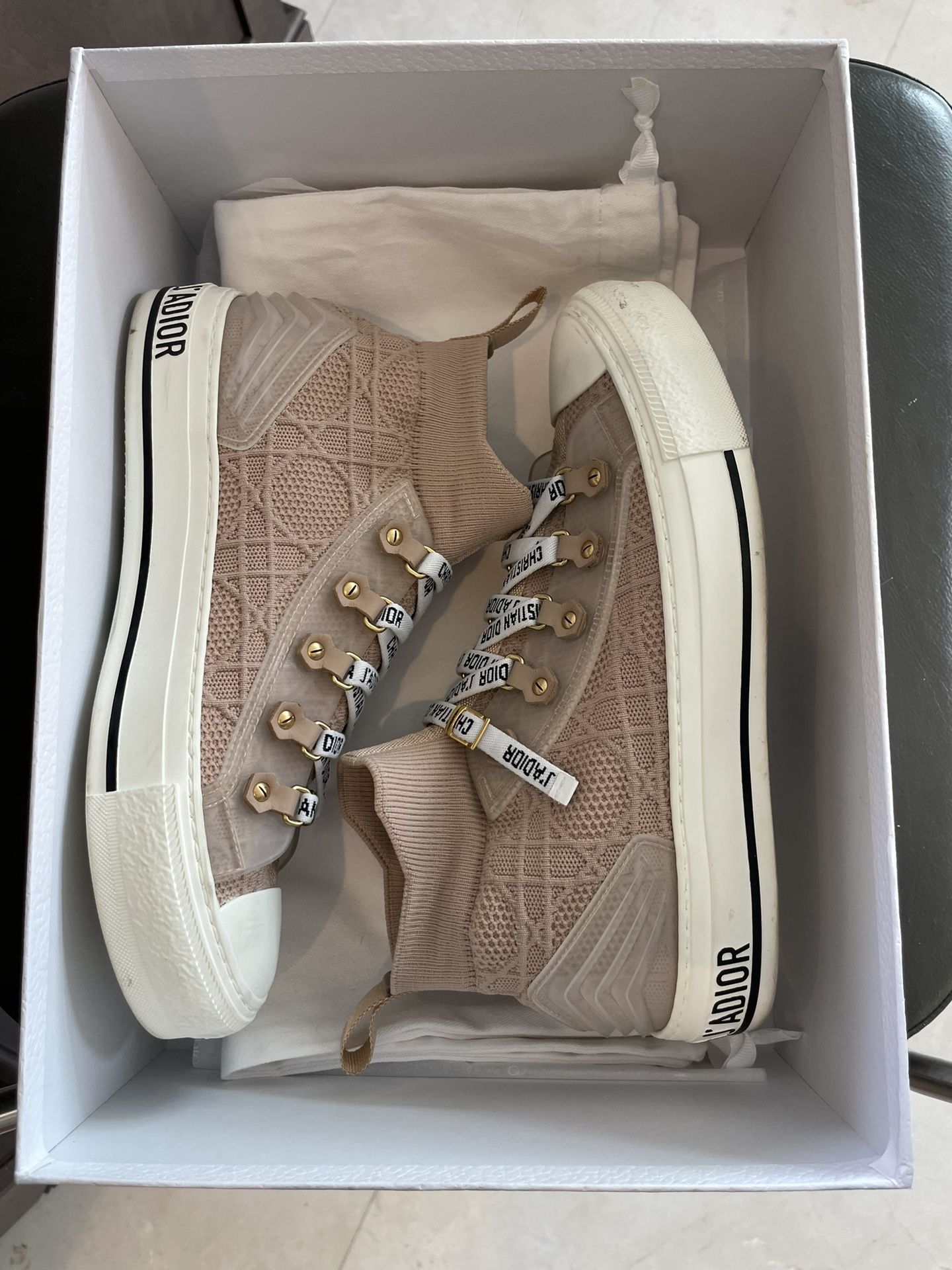 Completely authentic gorgeous Christian Dior hightop sneakers. Comes with original box and shoe bag. I also have original invoice from Neiman Marcus that I paid over $1000 for and selling an hour $800. I wore them one time out to lunch. They are in perfect gorgeous condition and waiting for there new loving owner.