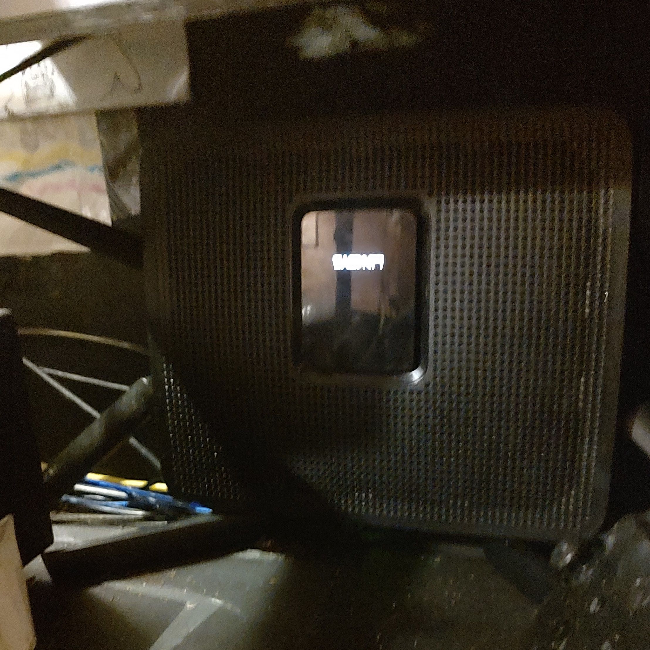 Black router with textured exterior and digital display. Features wireless connectivity and modern design.
