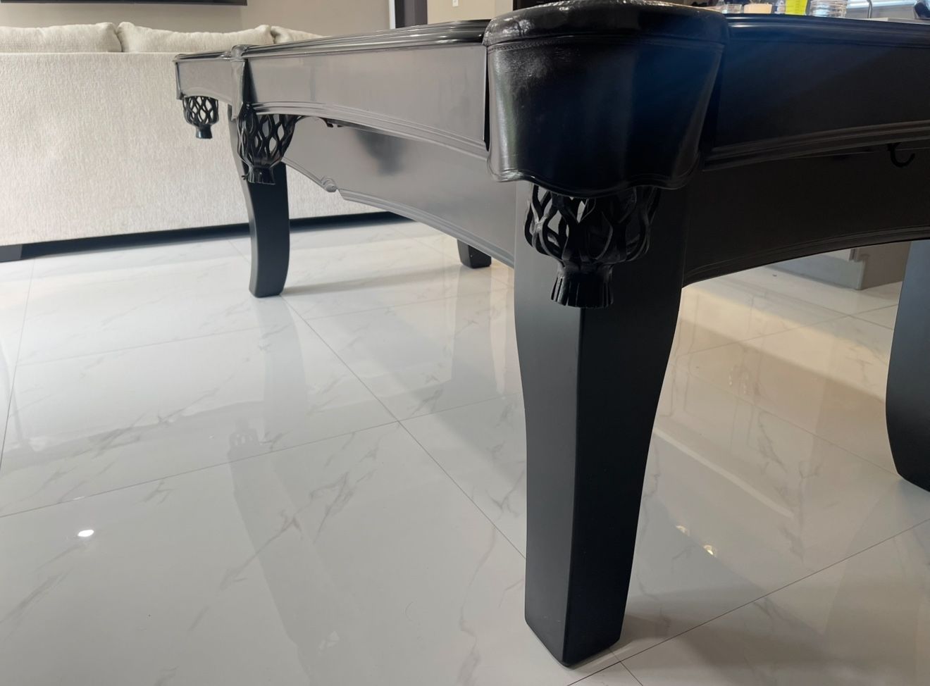 Modern black pool table 8’ Durable wooden frame, 3pc slate New genuine leather pockets New speedy cushions, new cloth color of choice Billiard accessories kit provided Pro delivery and setup to your home provided