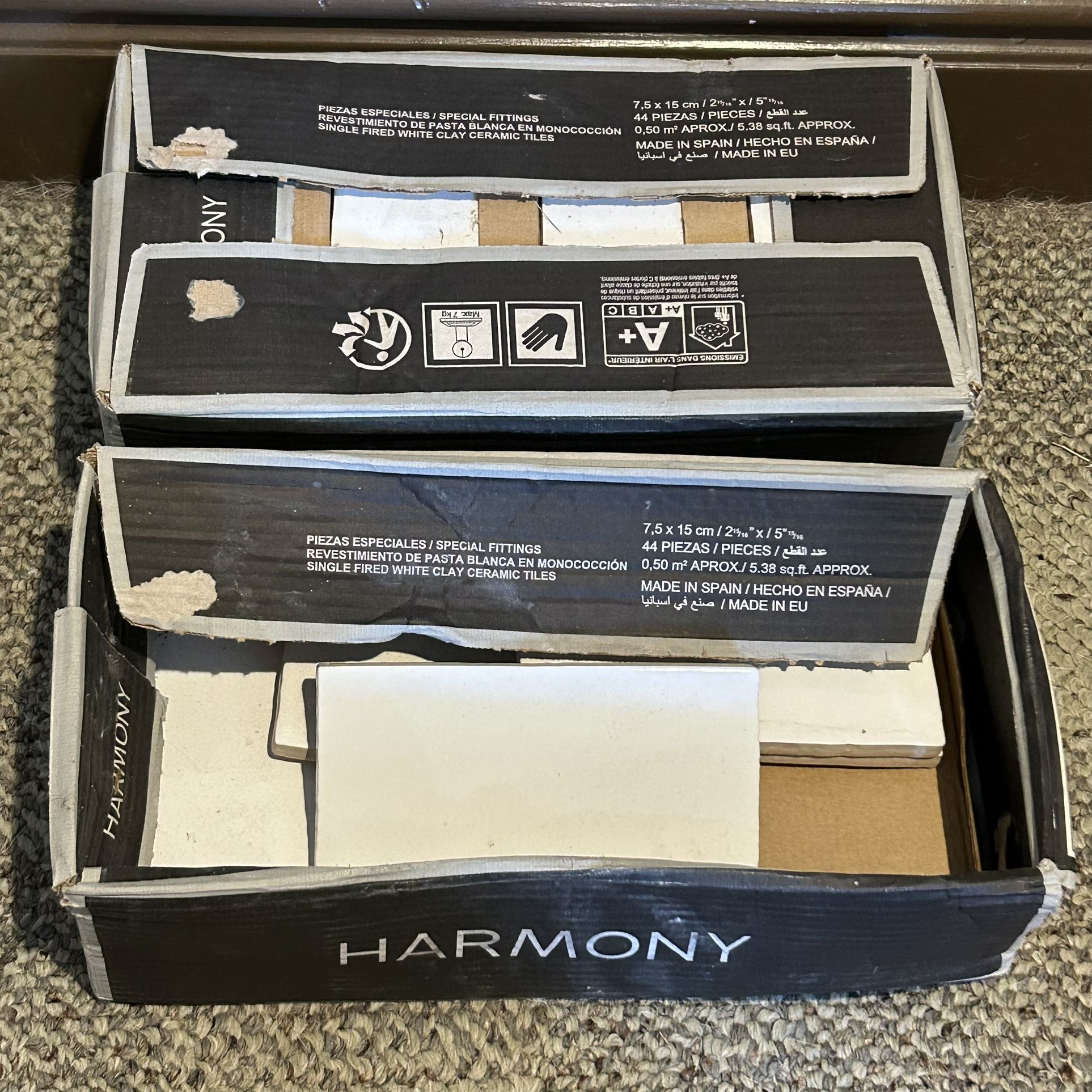 Harmony Ceramic Tiles White Glossy Ceramic made in Spain - About 13-14 pieces in the open box. Other box is new/full and has all pieces - See photos for measurements - About 57 pieces altogether