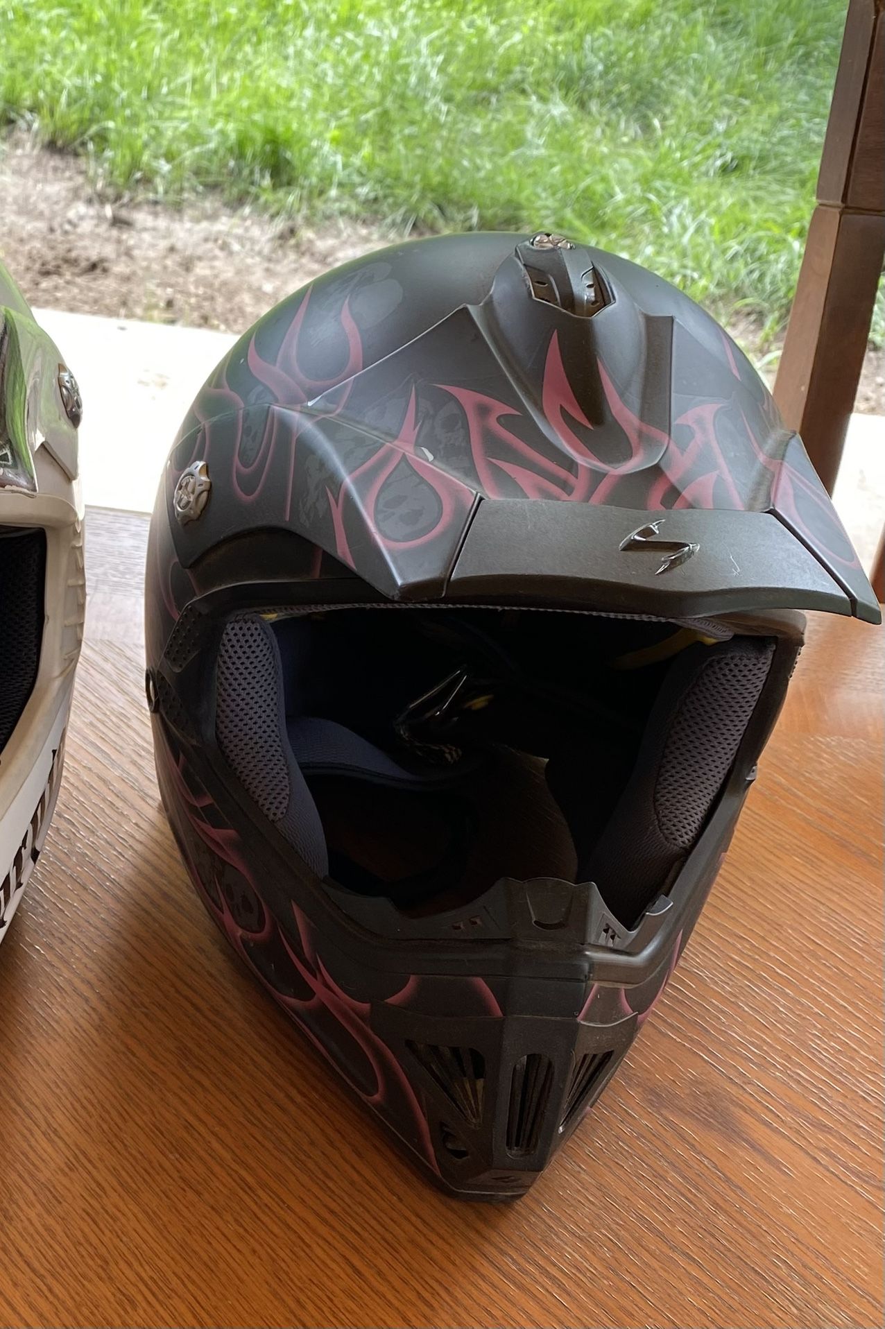 Barely used youth size Large motorcycle helmet. Daughter used it a few times while riding her dirt bike before buying a different style. Comes with goggles and bag. Must be able to pick up. Cash or Apple Pay only