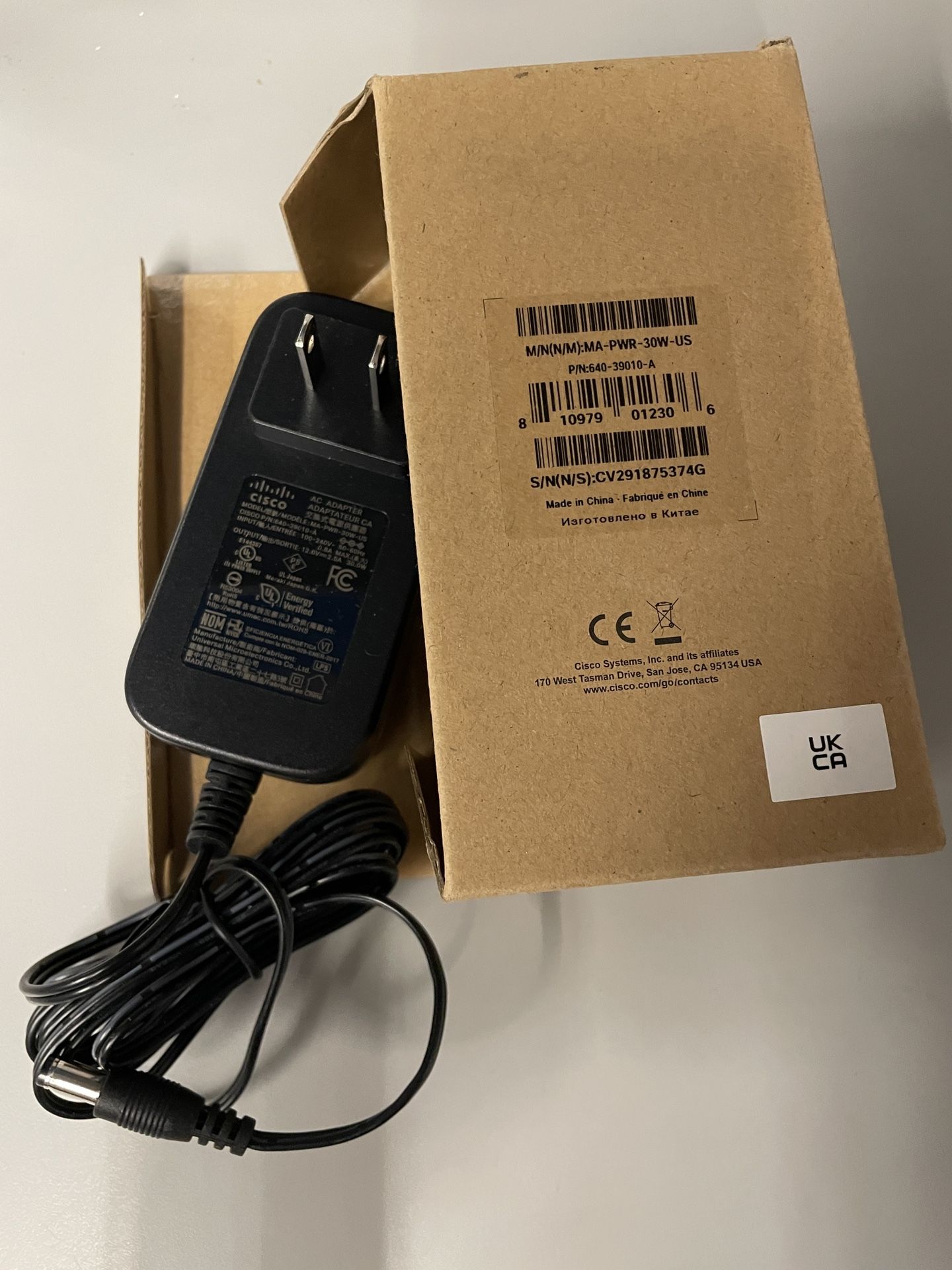 The product is a Cisco Meraki power cord specifically designed for use with the MA-PWR-30W-US model. This black cable is compatible with 12V voltage systems and has one outlet. Made in China, this unit is a reliable and high-quality option for powering your Cisco Meraki devices. Brand New in Box only unboxed to photograph.