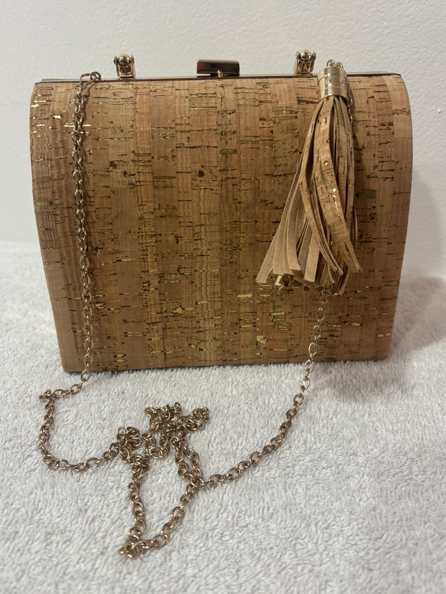 Purse has a gold tone chain link strap, cork fabric tassel, and gold stud interlocking the pattern. Used only a few times.