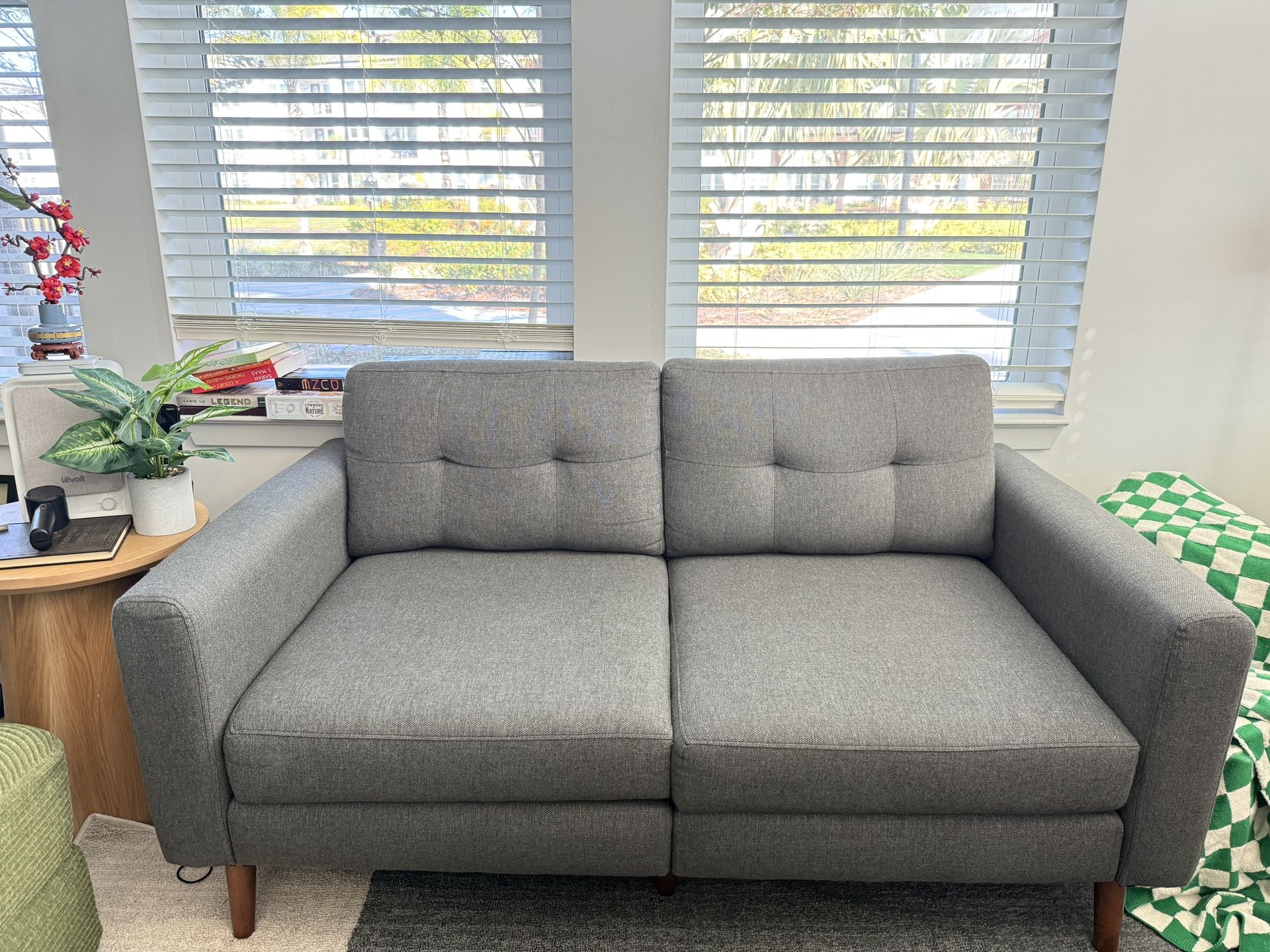 This listing is for a Burrow Nomad modular loveseat in the Heather Charcoal color. Fabric is scratch (pet) and stain resistant. There is a built in USB charging port. Cushions are reversible. Made with solid wood. Couch is modular and can be expanded with add ons from Burrow. In great condition, comes from a smoke and pet free home. Sanitized with green machine upholstery cleaner.