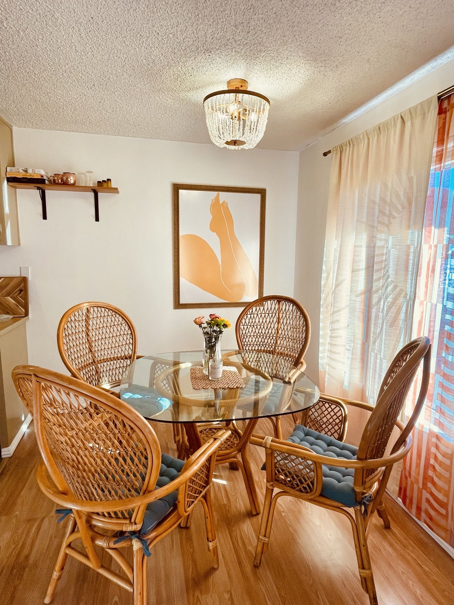 This beautiful set is in great condition! Dining set with four chairs and cushions. Glass has minor scratches. Glass is very heavy.